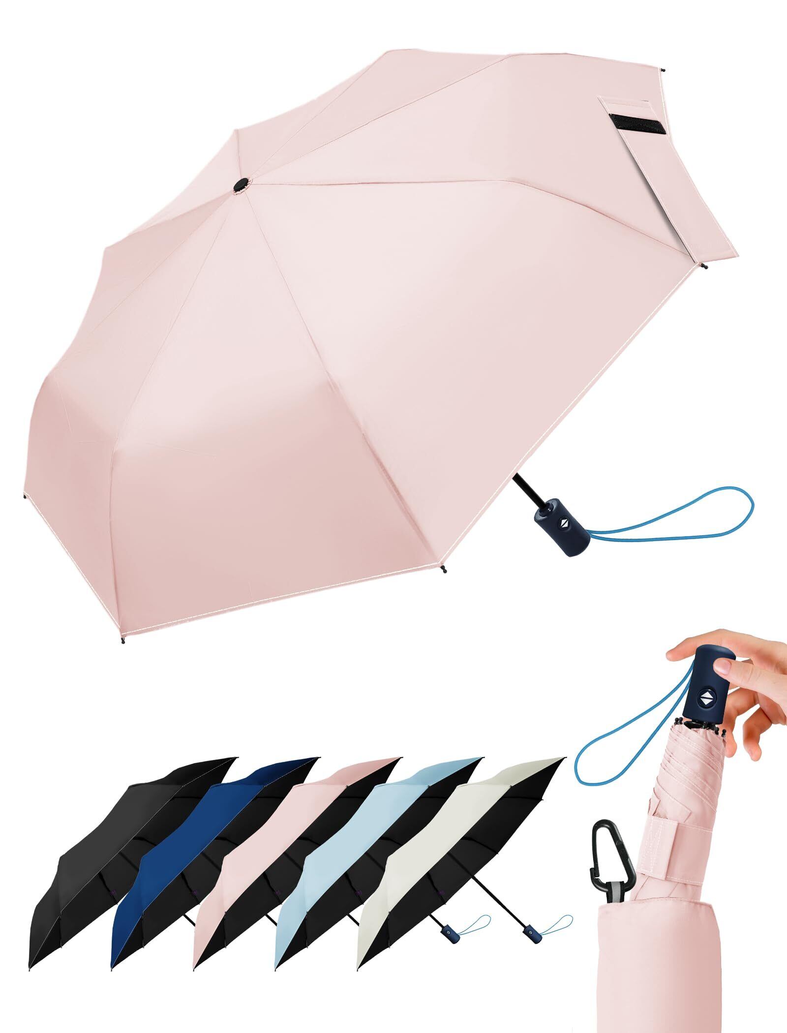 「撥水抜群」当折りたたみ傘は高密度生地と1cm4目スチールの水膨張糸を採用、傘の縫い目部分からも水漏れしません。高密度190T生地を採用し、耐水圧500dpi以上(業界標準は350dpi)、撥水等級4~5級(JIS 1092認証済)を達成します。豪雨の中でも数回軽く振るだけで簡単に水滴を落とせ、乾きやすい特性も備えています