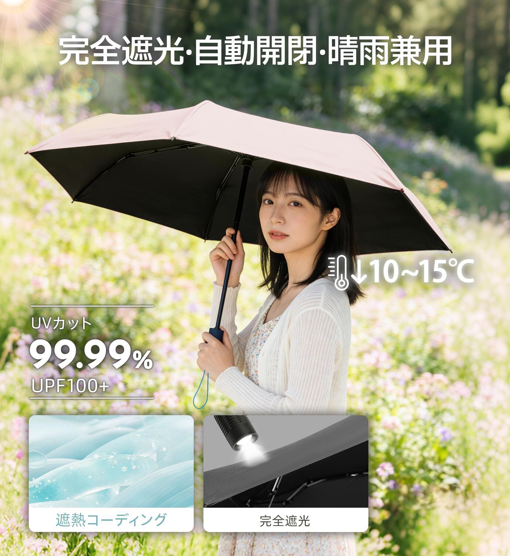 「完全遮光・UPF100+」 高密度生地に遮光コーティングを施し、99.9%以上UVカット・完全遮光を実現。UPF100+の最高水準で、真夏の強い日差しや紫外線を徹底的にブロックします。肌を守るだけでなく、傘の下は木陰のような涼しさで、熱中症対策にも最適です。
