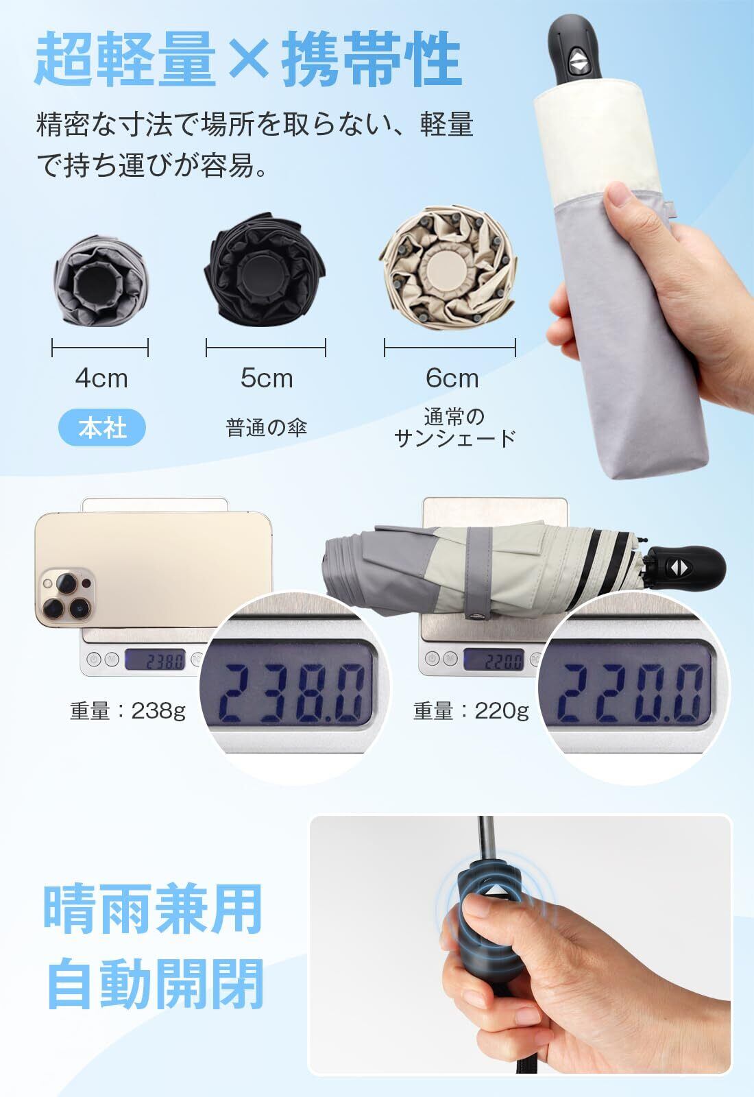 【超軽量・携帯性抜群】折りたたみ式の日傘は、フラットなデザインで折りたたみ傘バッグに簡単に収めることができます。折りたたまれた際の厚さはわずか4cm、長さは25cm、重量は約220gです。