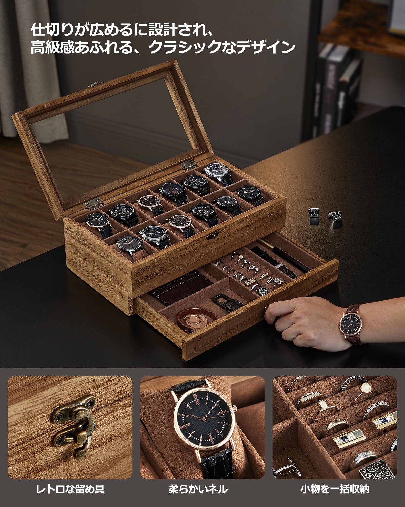 【収納力たっぷり】引き出し付きなので、腕時計を12本収納できて、指輪・ネックレス等のジュエリー収納用としても活躍できます。クッションを取り外せるデザインで、実用性がたっぷりです。
