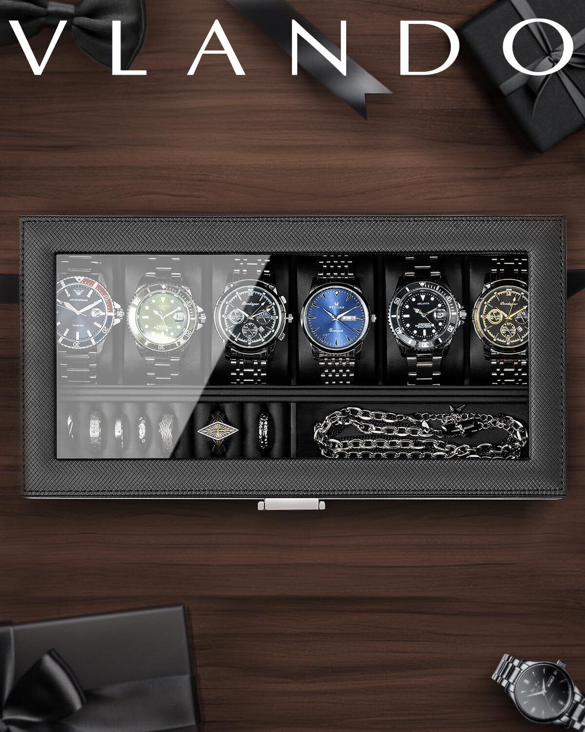 VLANDO 腕時計ケース 6本 PUレザー ウオッチボックス ロック可能 鍵付き メンズ アクセサリーケース ジュエリー収納 リング 指輪 誕生日プレゼント(ブラック)