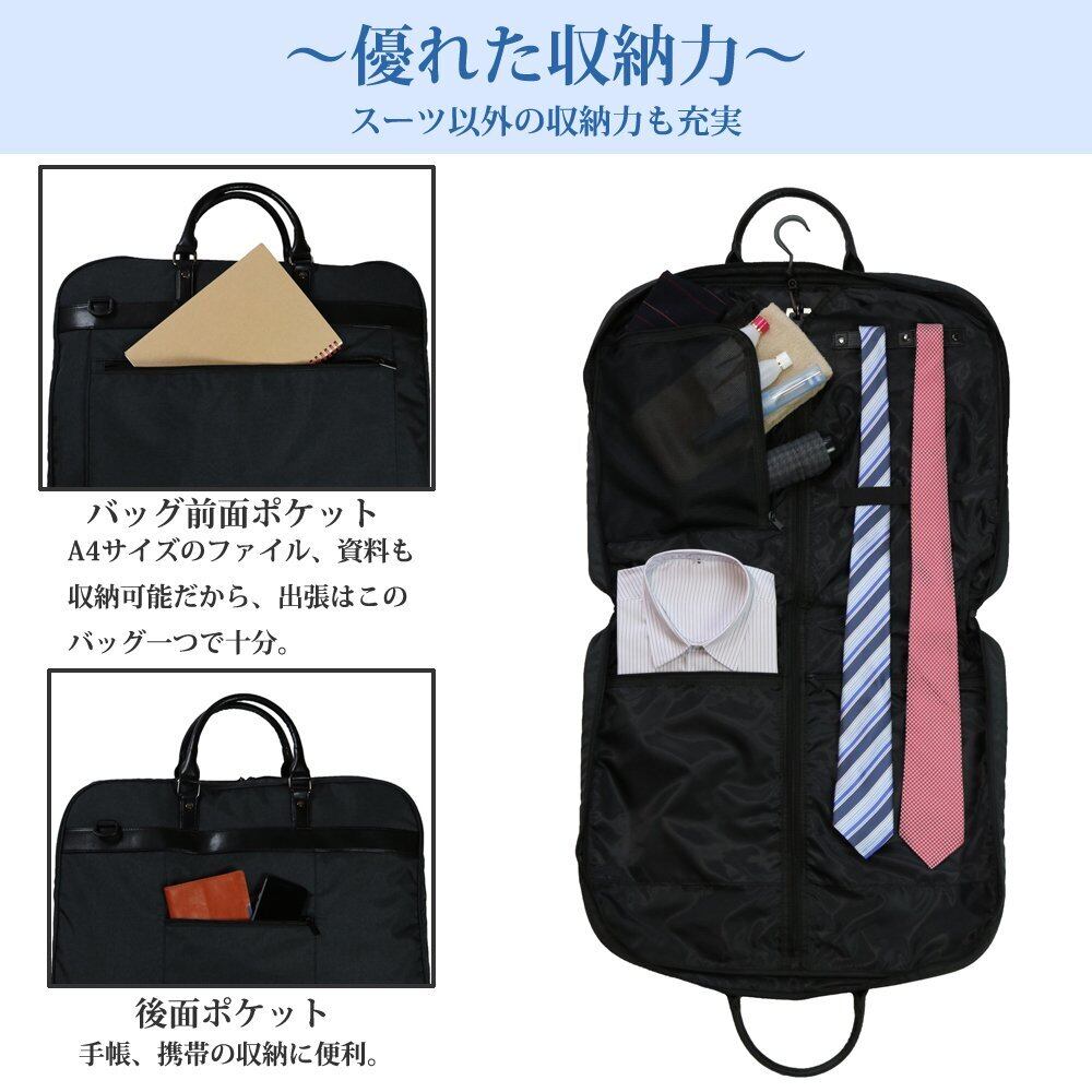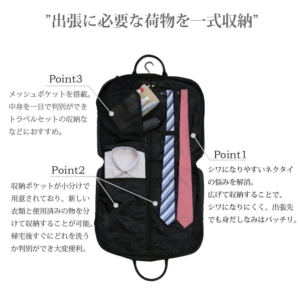 ビジネスマンであればキレイなスーツを着るのが常識。只、簡易なガーメントバッグだと持ち運びの際にシワが付いてしまうことも。この悩みを解決するのがこのガーメントバッグ。持ち運ぶ際にスーツがズレてシワにならないよう考えられた設計。