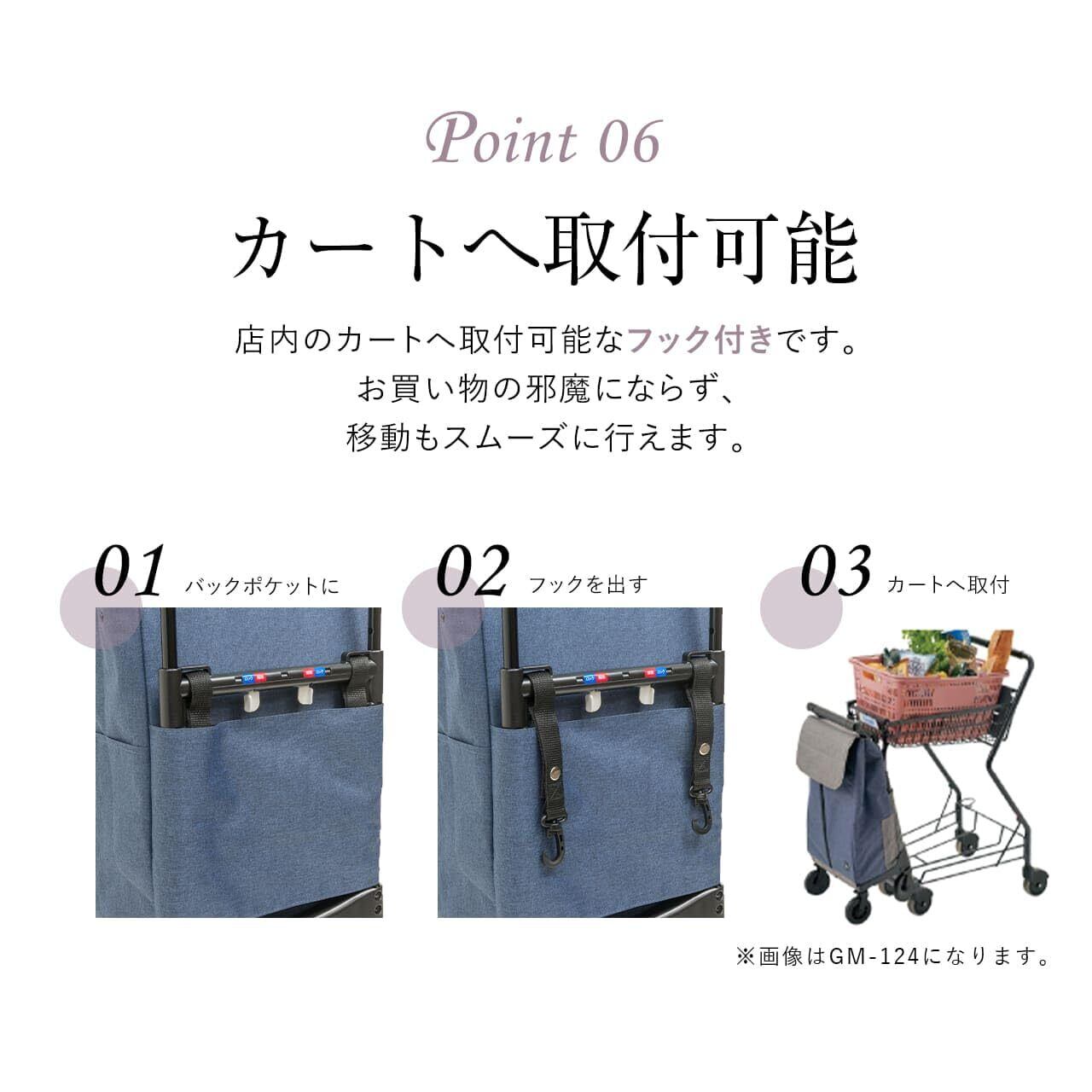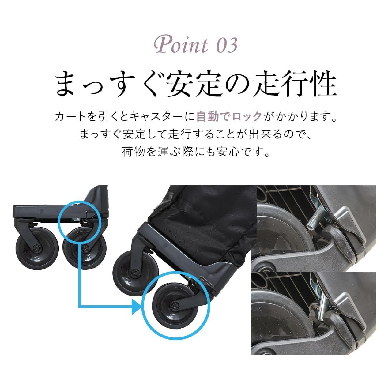 【もっと便利で安全なお買い物を】大きく開く間口は、長さのある物や角ばった物でも簡単に収納可能で取り出しも容易です。さらに店内のカートへ取付可能なフック付きで、お買い物の邪魔にならず移動もスムーズに行えます。また、カートを引くとキャスターに自動でロックがかかり、まっすぐ安定して走行することができるので、荷物を運ぶ際にも安心です。