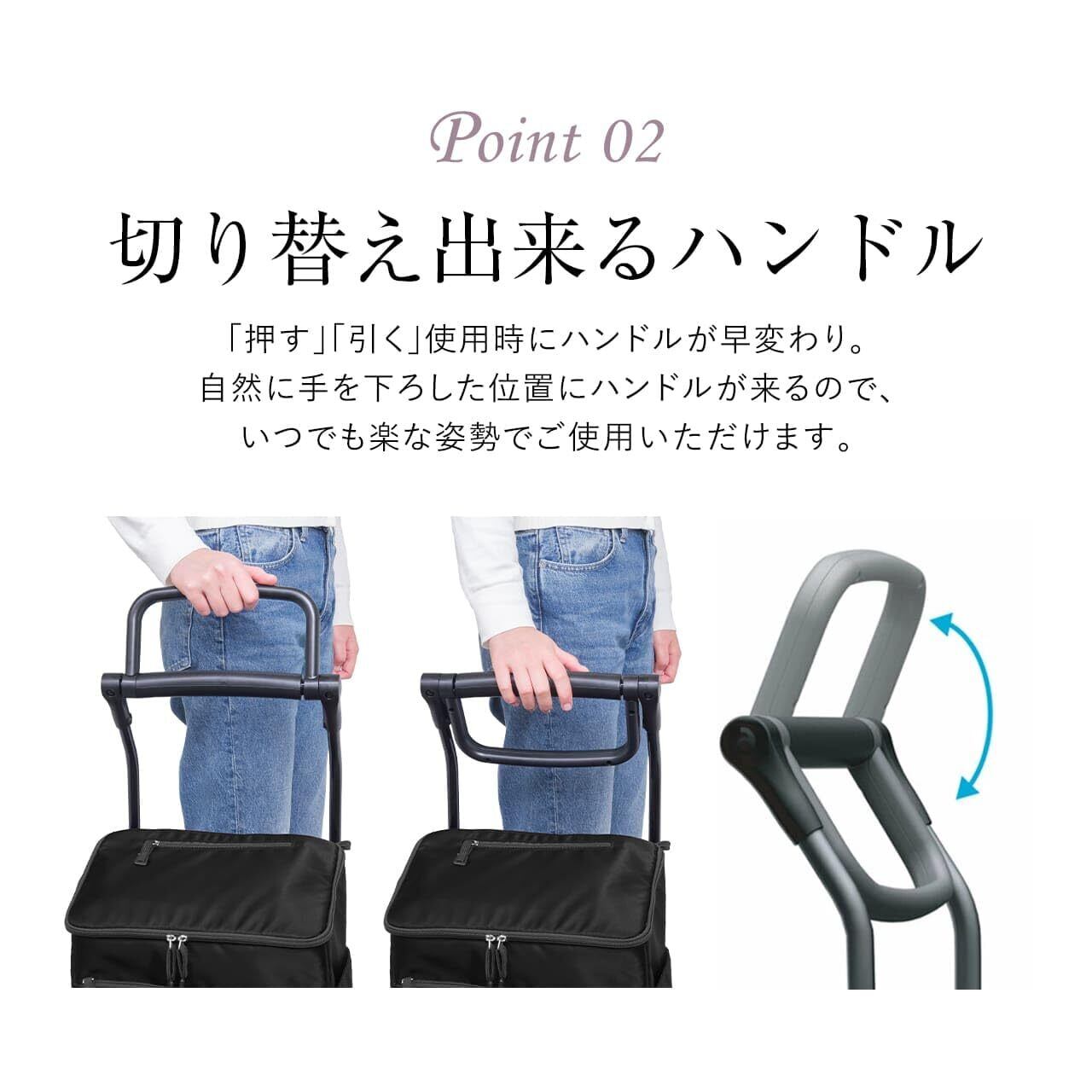 【軽量設計なのに大容量】狭い道では「押す」、荷物が重いときは「引く」など路面の状況や、店内、公共交通機関など、様々なシーンに合わせてハンドルを折り畳むだけで切り替わる2Wayタイプのキャリーカート。安定感のある4輪で、わずか2.4kgの軽量設計。容量は24Lの大容量で最大10kgの荷物を入れて持ち運ぶことができます。