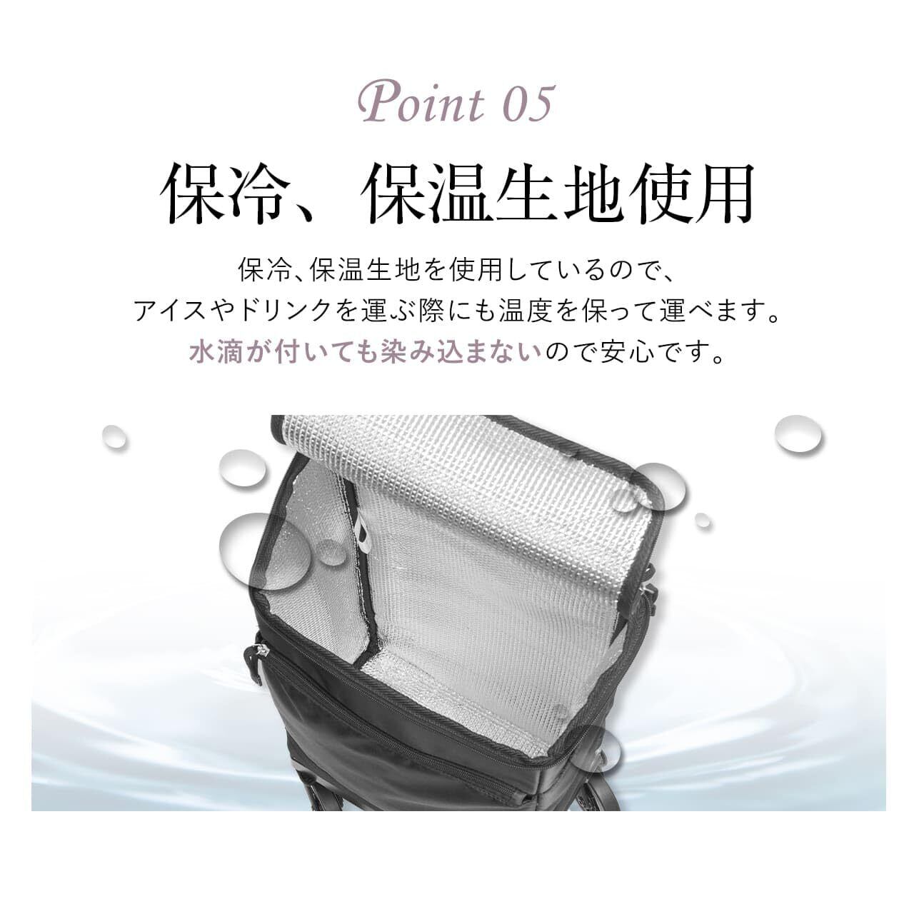 【一年中これ一台でOK】保冷、保温生地を使用しているので、アイスやドリンクを運ぶ際にも温度を保って運搬可能。水滴が付いても染み込まない生地を採用し、季節を問わず通年で快適にご使用いただけます。
