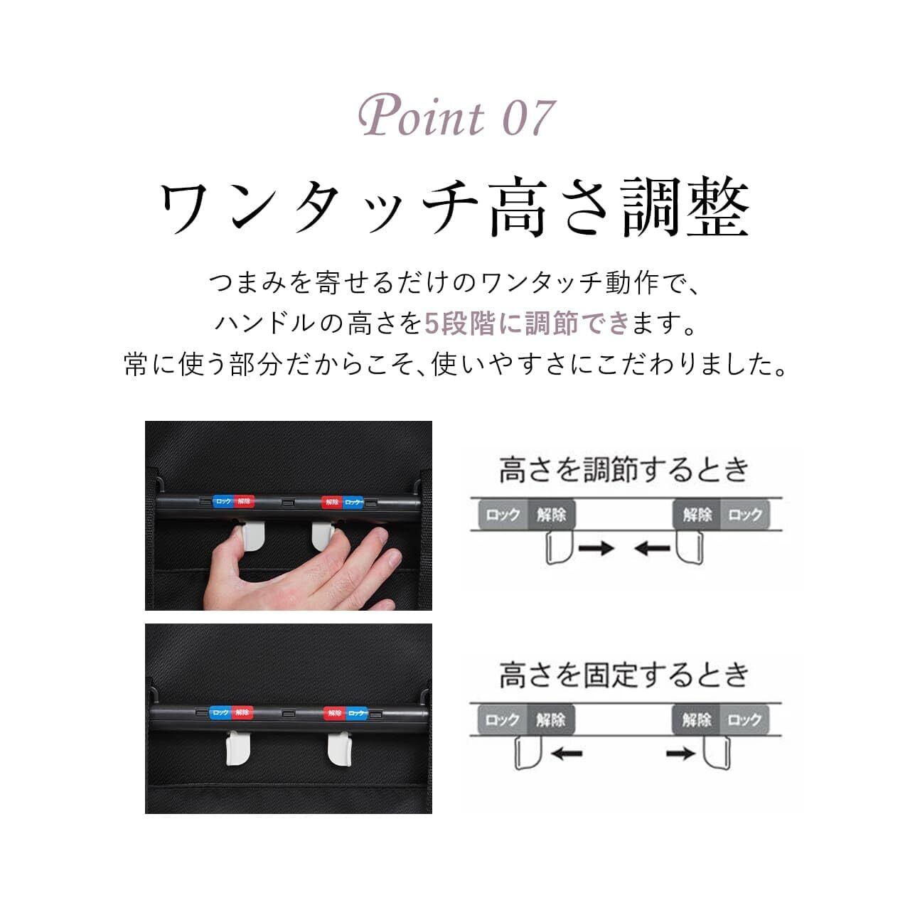 特徴 ロック式キャスター, 伸縮式ハンドル, 機動性がある, 軽量, 高さ調節可能
