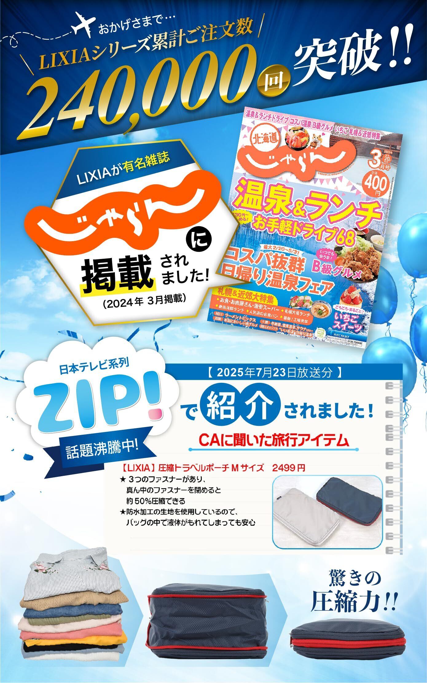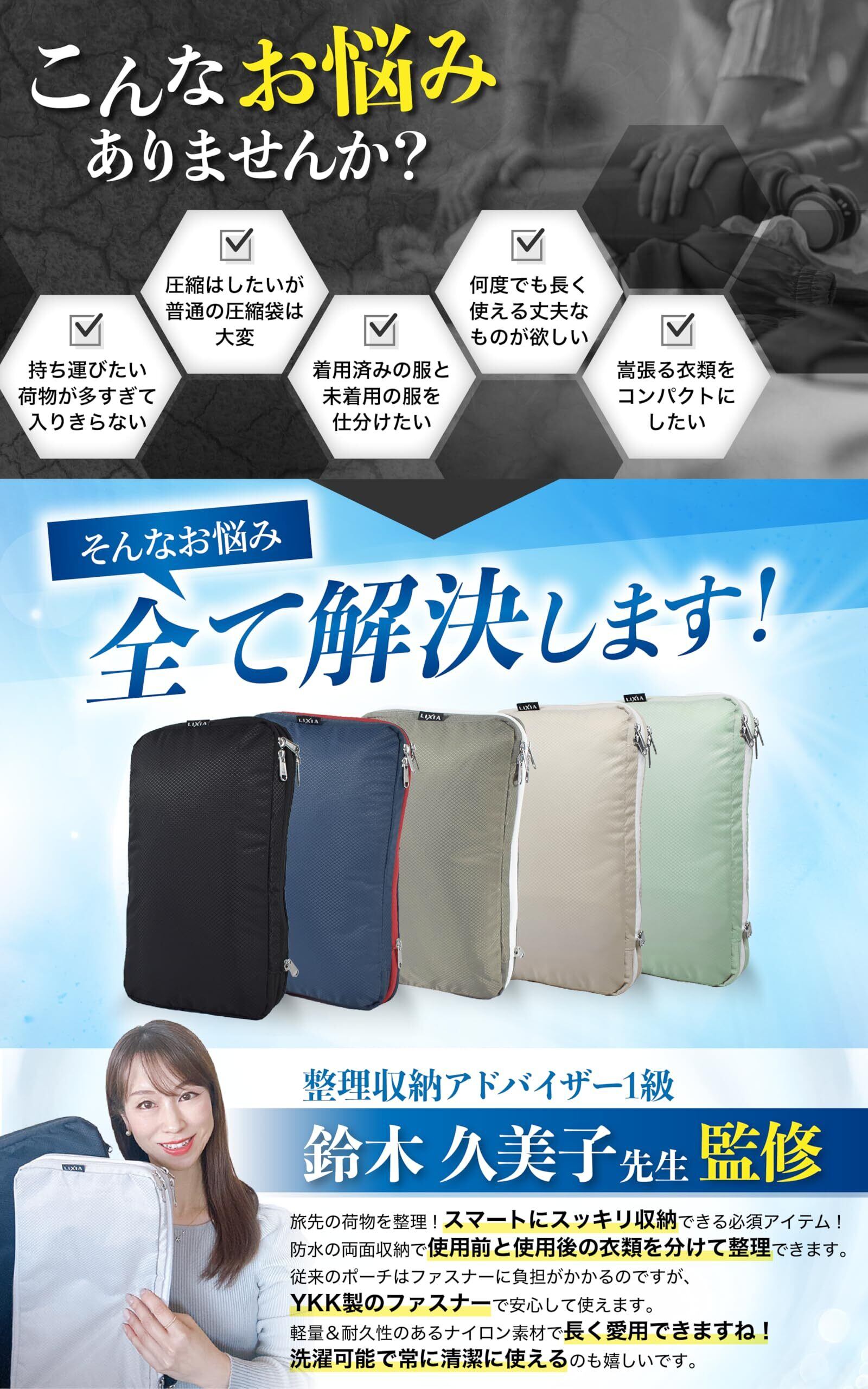 【ファスナーを閉めるだけで簡単圧縮】 かさばる衣類があっという間にスッキリ!衣類を畳んで納め、チャックを閉めるだけで約50%圧縮できるバッグです。是非LIXIAの圧縮バッグで荷物に囚われない旅行をお楽しみください!