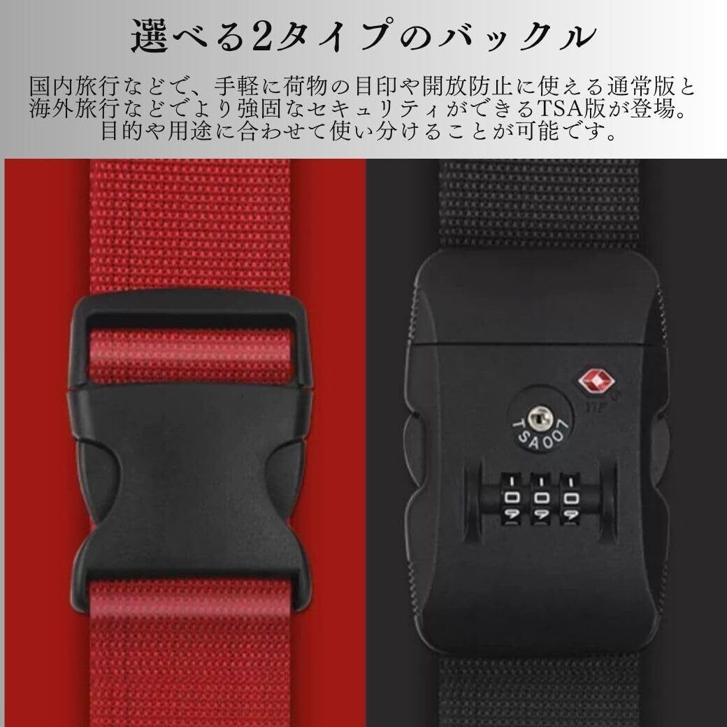 【選べるロックの種類】通常のバックル式とTSAロック式の2つから選ぶことができます。通常のロック式は荷物の目印や国内旅行などの荷物トラブルが少ない時に手軽に利用ができます。TSAロック式のベルトは、セイキュリティがより強固なものとなっており海外旅行などでの荷物の盗難防止にも効果的です。