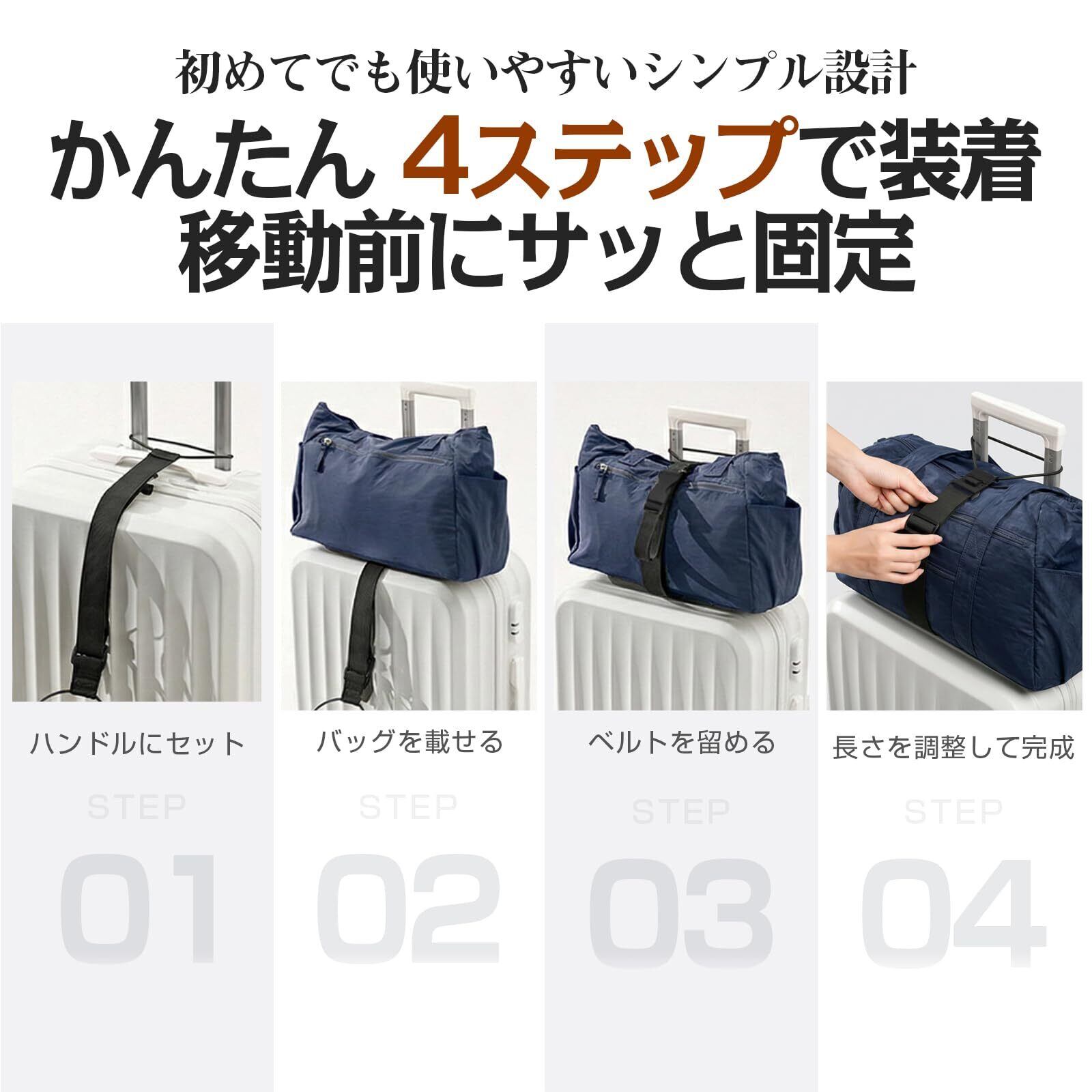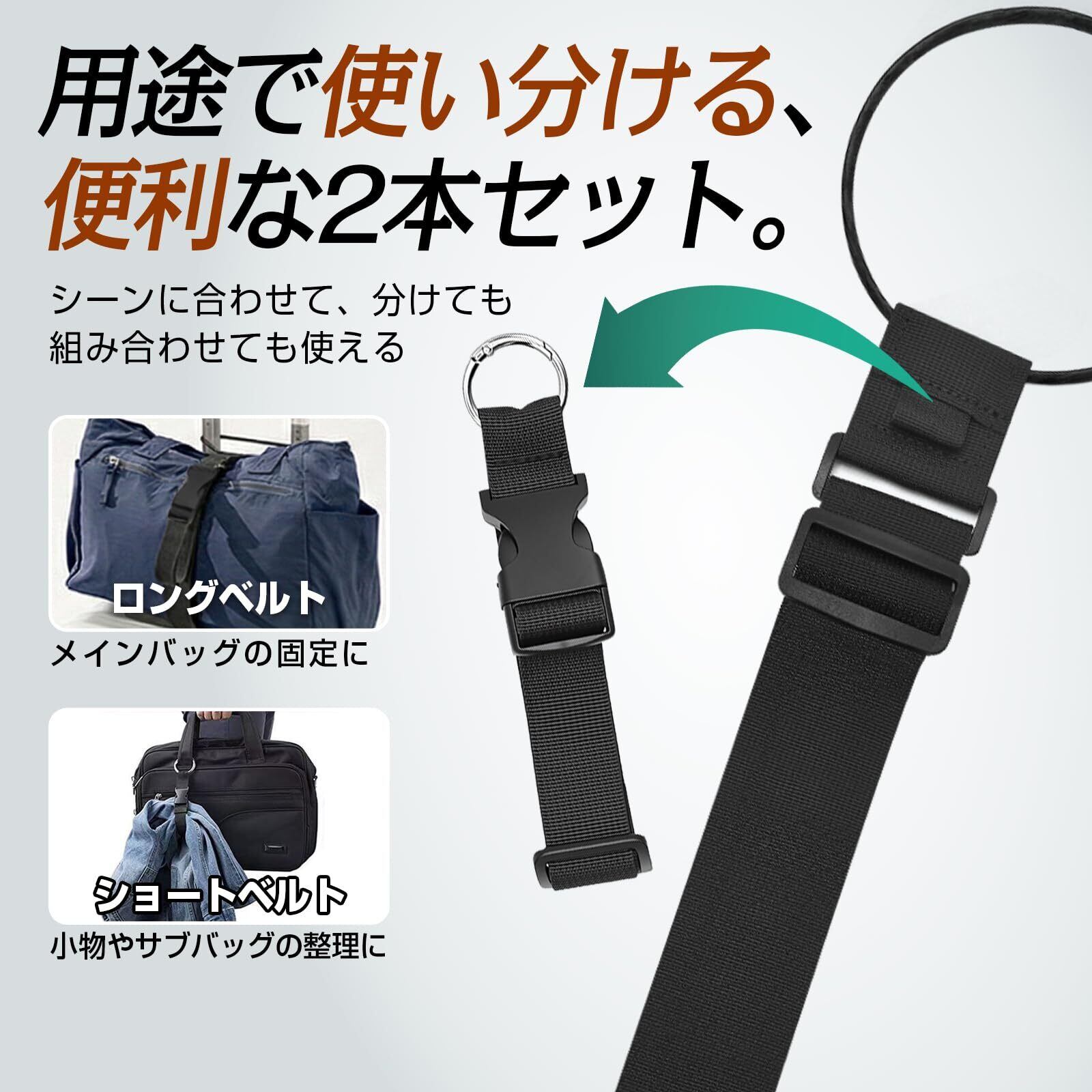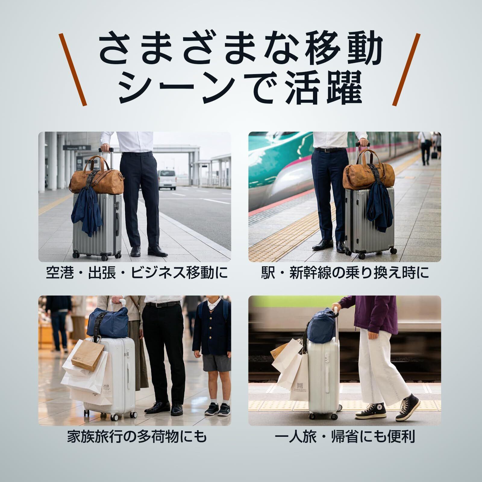 ✈⑤【重量荷物も強固固定、移動を快適に】5cm 幅のロングベルトは幅広設計で、ボストンバッグやパソコンバッグなど重量のあるメインバッグを面でしっかり支え、ズレや落下を強力に防止。安定感抜群で、重い荷物も安心して固定でき。2.5cm 幅のショートベルトは、ジャケットやお土産袋などの小物をスッキリまとめるのに便利。空港や駅、旅行・帰省・出張など、さまざまなシーンでスムーズな移動をサポートします。