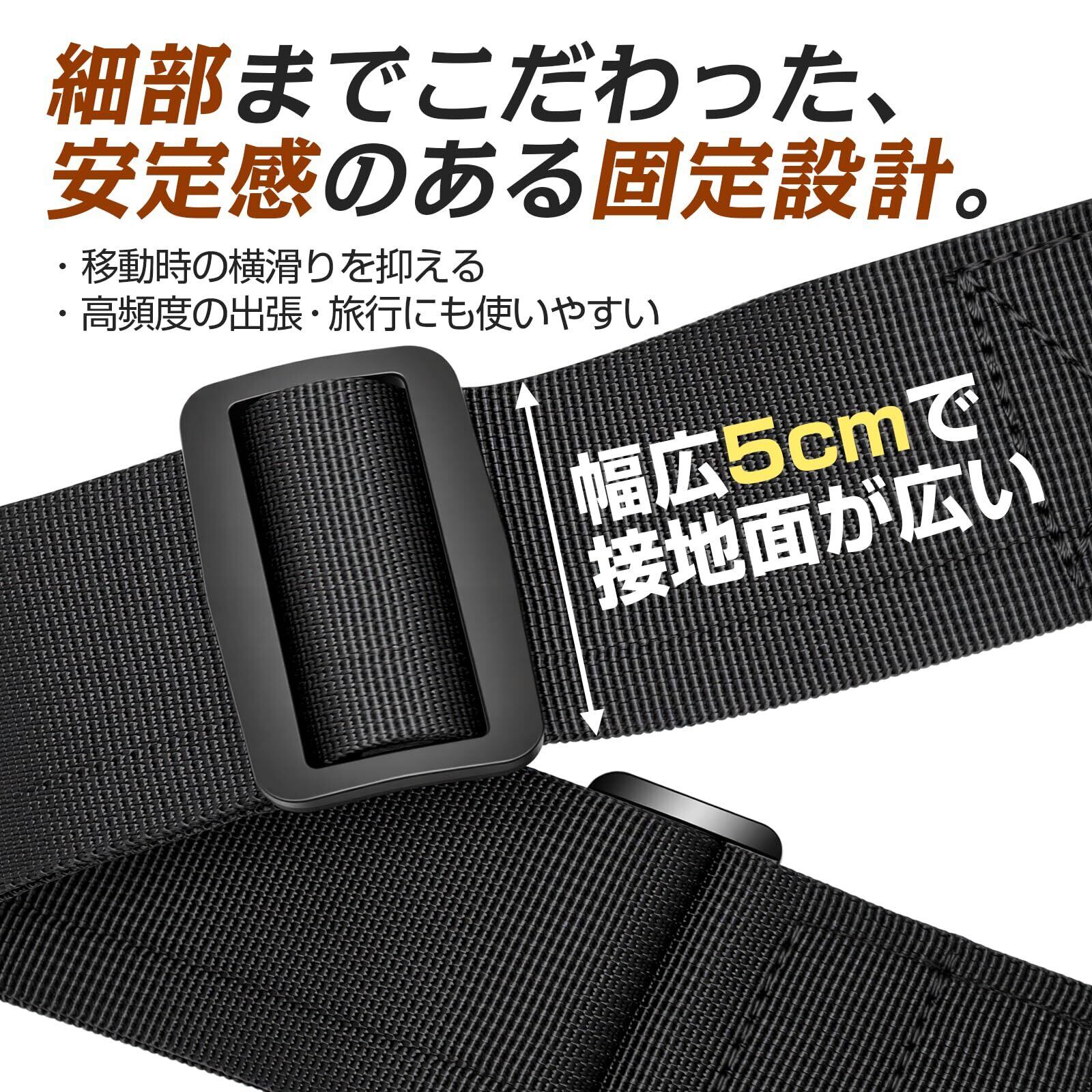 ✈③【幅 5cm 進化!ズレ落ち防止】メインベルトの幅を従来の3.8cmから「5cm」へ拡大。接地面が広くなることで、大きなバッグや重い荷物もしっかりホールド。移動中の振動による横滑りや、角を曲がる際のずり落ち・荷崩れを抑え、安定した移動をサポートします。