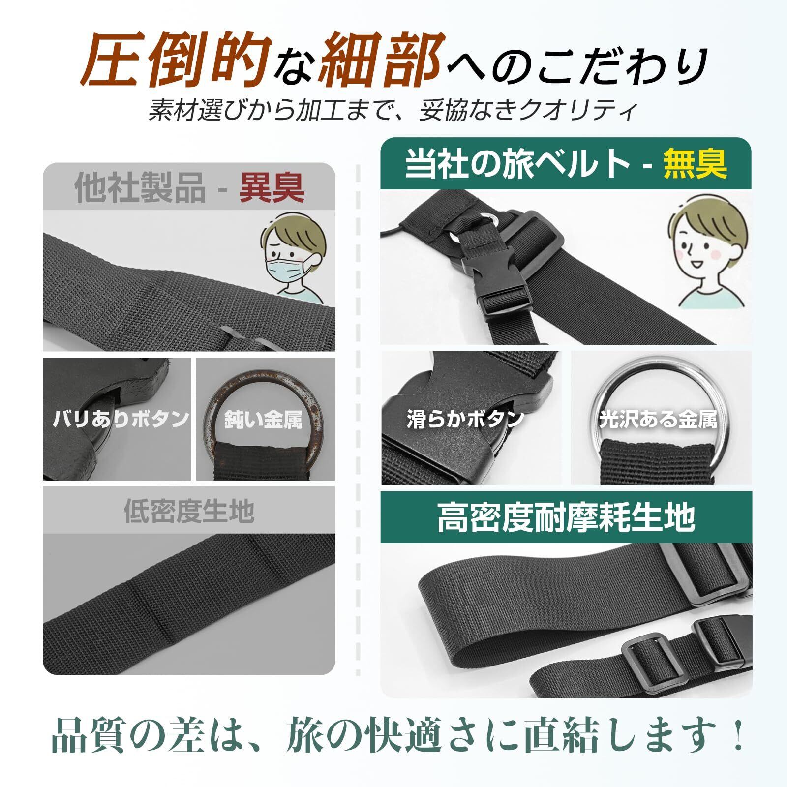 ✈④【素材強化!しなやか高密度織り】こだわり抜いた高密度織り素材を独自採用し、耐久性・しなやかさ・肌触りを高いレベルで両立。一般的な革ベルトのような硬さがなく、荷物の形状に柔軟にフィットするため、大切なスーツケースを傷つける心配がありません。摩擦に強く、長期間の使用でも型崩れしにくいプロ仕様に仕上げており、上質な質感と高級感を兼ね備えています。上質な肌触りとプロフェッショナルな設計が旅の質を高め、心地よく上質な移動体験をお届けします。