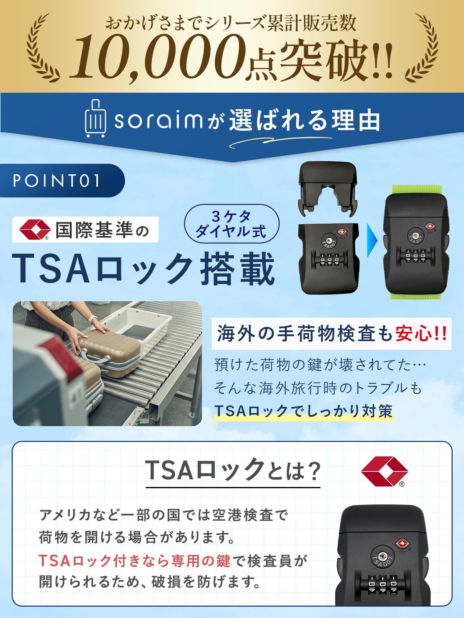 【安心のTSAロック】海外旅行でも安心のTSAロック搭載。検査時も壊される心配がなく、貴重品や荷物をしっかりガード。安全性を高めつつスムーズな渡航をサポートするスーツケースベルトです。