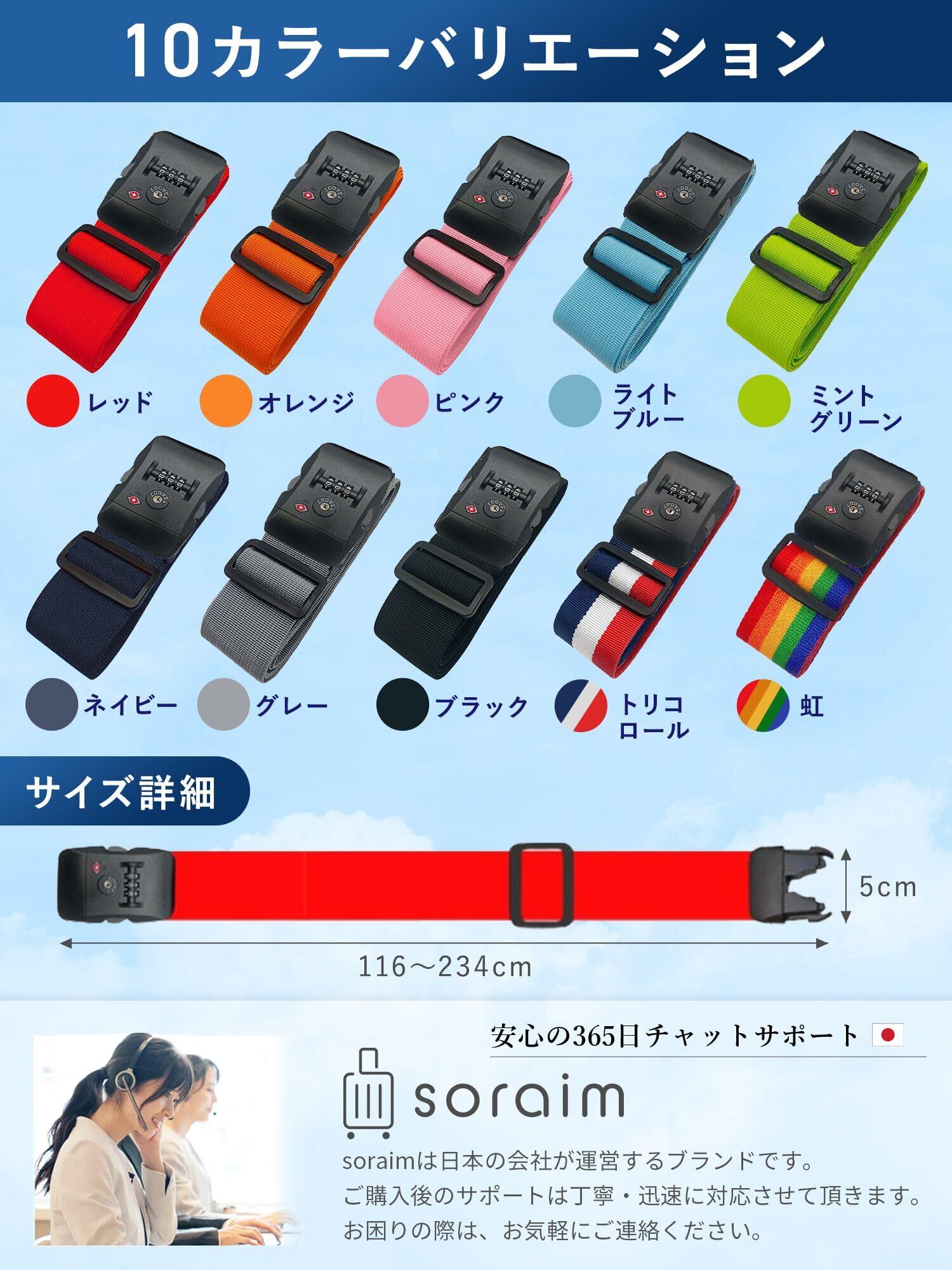 【どんなケースでもピッタリ】soraimのキャリーケースベルトは、長さを 102~200 cm で調節可能。どんなスーツケースでもピッタリフィットします。