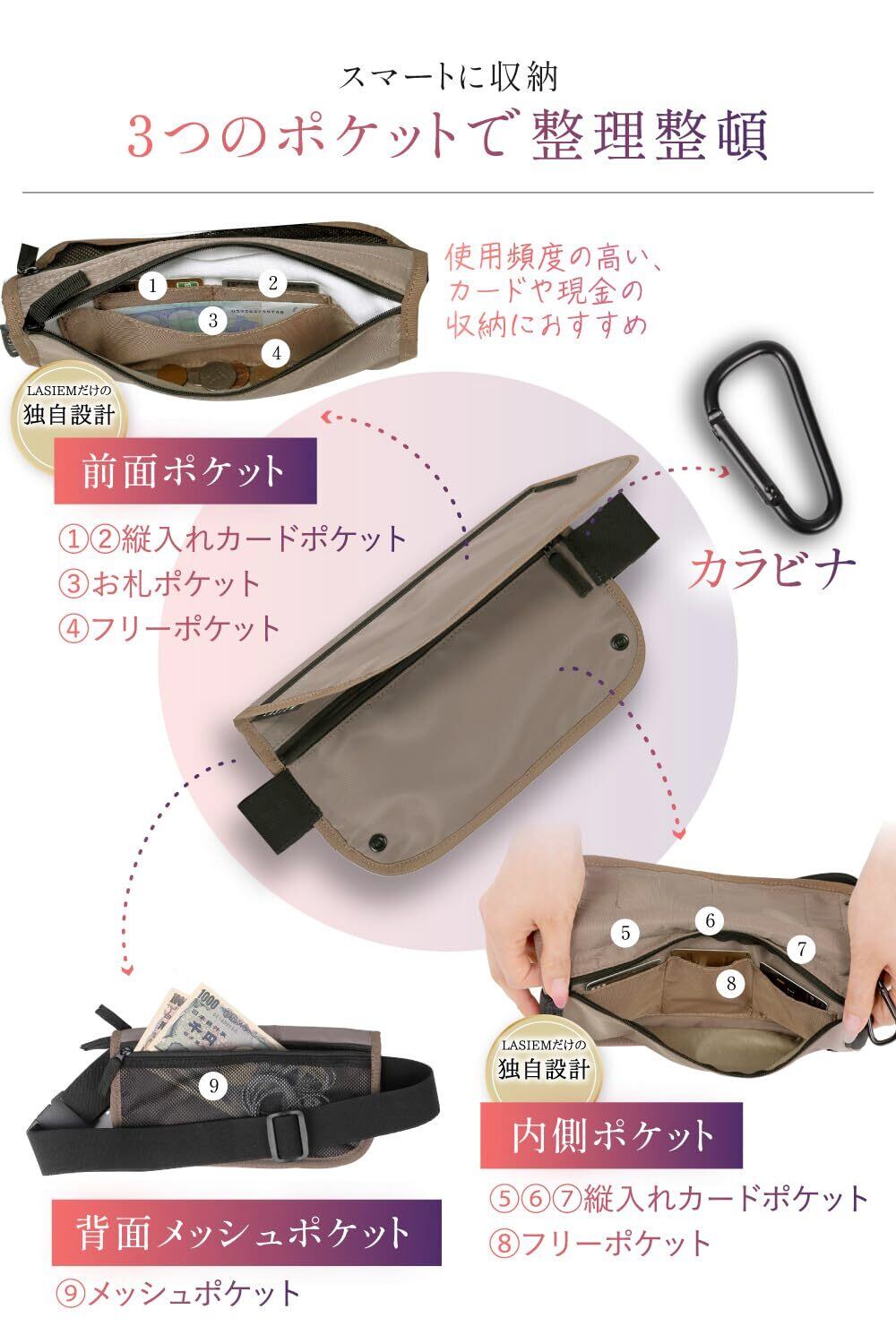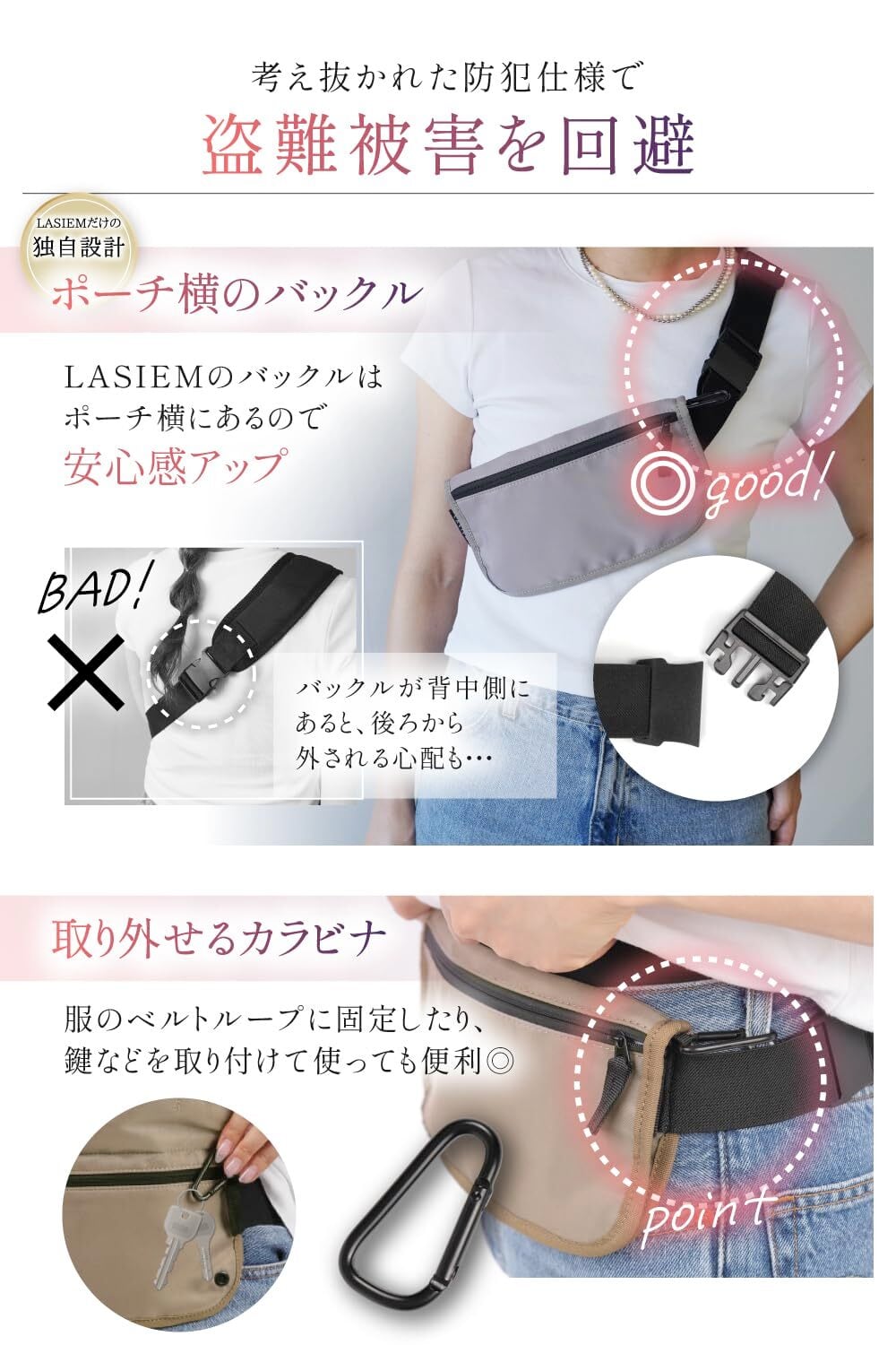 【セキュリティ対策を考え抜いたセキュリティポーチ】LASIEMオリジナル セキュリティポーチが誕生! (1)全面スキミング防止 (2)服に隠れる薄型設計 (3)カラビナ付き (4)側面バックル採用