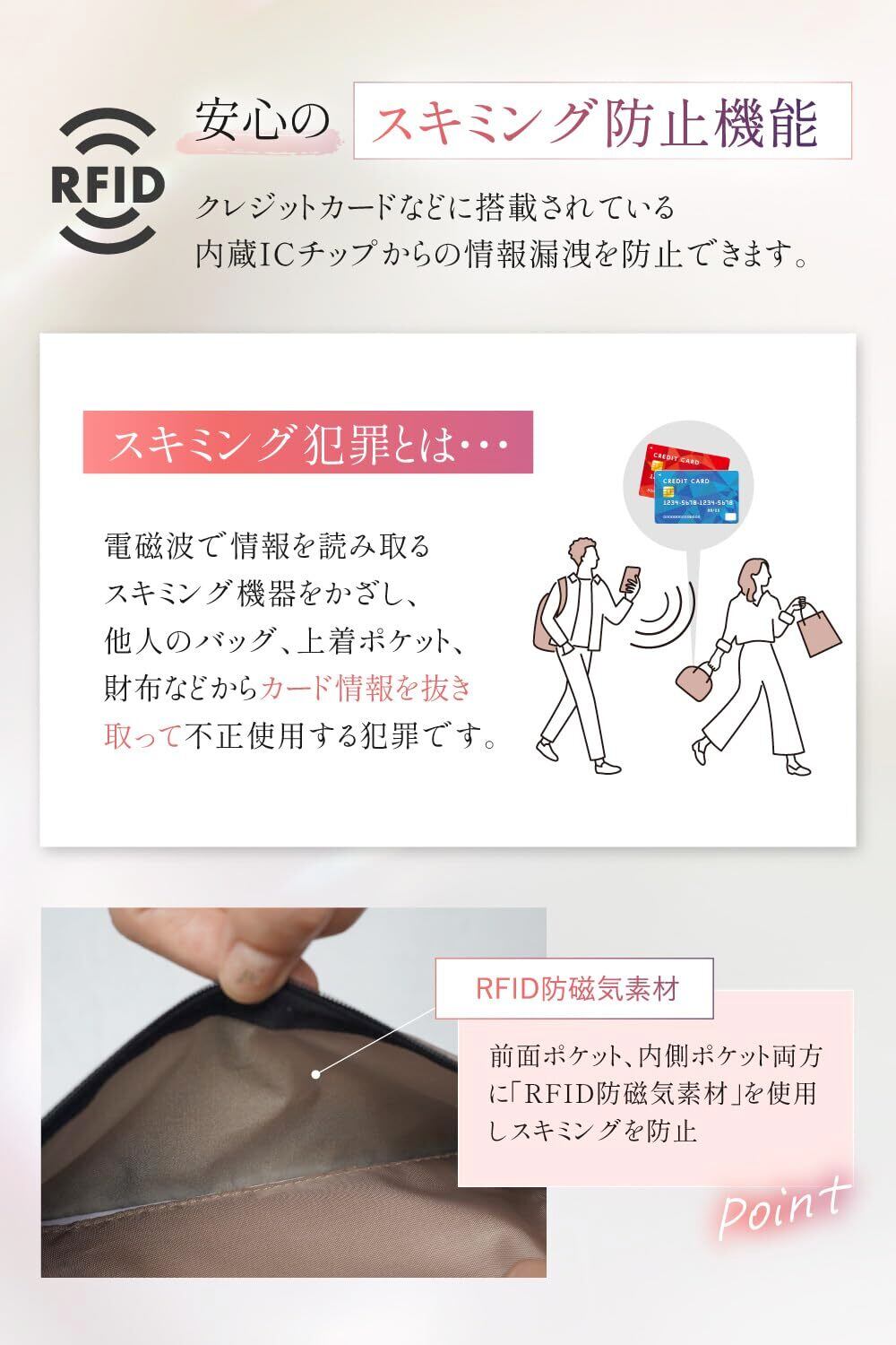 【こんなお悩みありませんか?】「初めての海外旅行楽しみだけどトラブルに遭わないか心配」「貴重品の管理はどうしたらいい?」「せっかくだから思いっきり楽しみたい」 \考え抜かれた防犯仕様で盗難被害を回避/ (1)ポーチ横のバックル→LASIEMのバックルはポーチ横にあるのでバックルを後ろから外される心配はありません! (2)取り外せるカラビナ→服のベルトループに固定したり、鍵などを取り付けて使っても便利◎ (3)スキミング防止→前面ポケット、内側ポケット両方に「RFID防止素材」を使用しスキミングを防止!