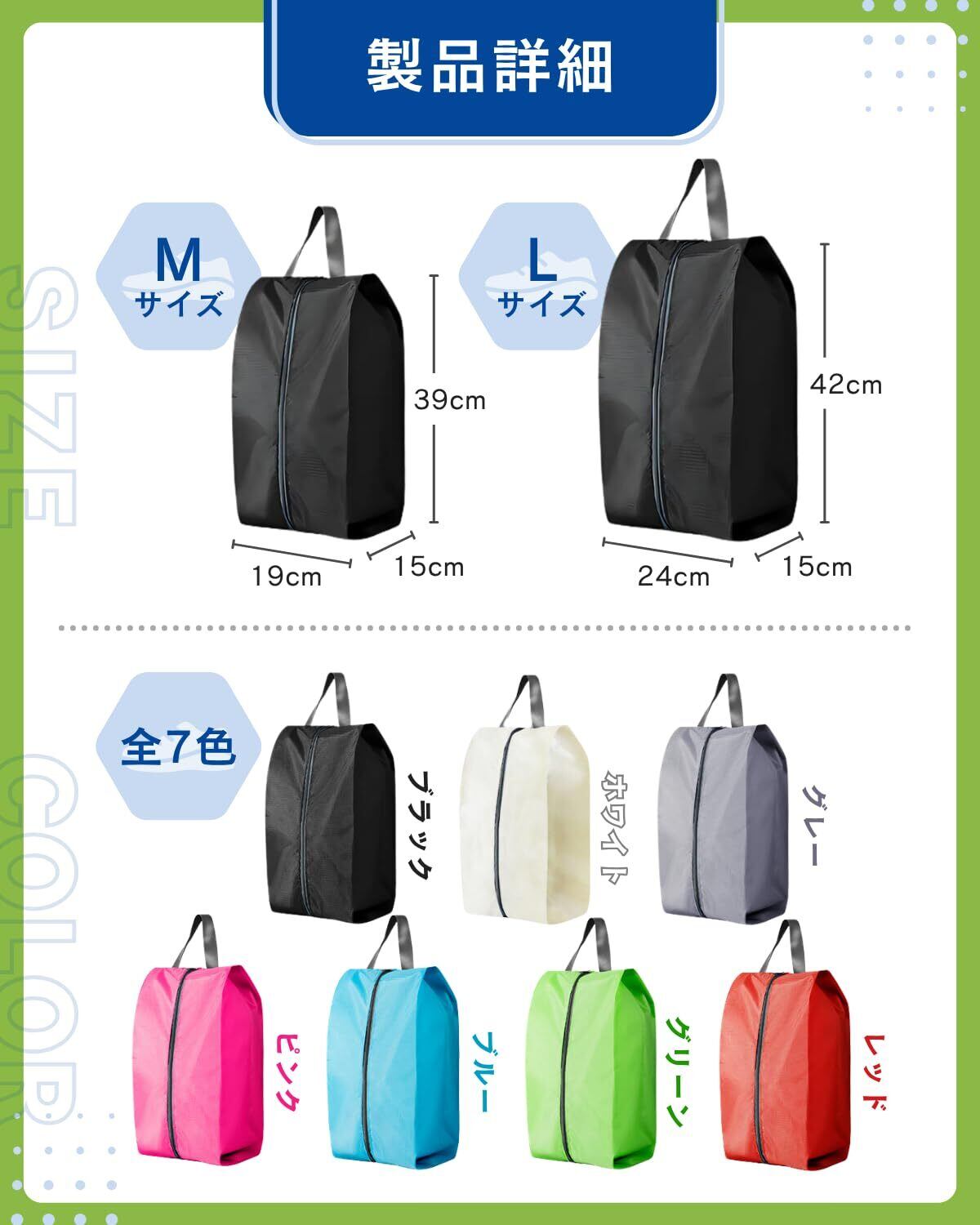 【あらゆるシューズをスマートに収納!多用途で使えるシューズバッグ】シューズバッグは、上履きやバスケットシューズ、サッカーや野球のスパイクなど、さまざまな靴を清潔かつスマートに持ち運べる必需品。通学・通勤・ジム通い・スポーツ活動・旅行時など、あらゆるシーンで活躍します。靴袋としてだけでなく、小物や衣類の収納にも対応。家族で色違いを使い分けるのもおすすめです。 【防水&通気性を両立した素材で、靴を快適に保護】外側には水や汚れをはじく防水加工生地、内側には通気性に優れたメッシュ構造を採用。湿気がこもりにくく、シューズを快適な状態に保ちます。運動後のバスケットシューズやサッカーシューズも衛生的に収納可能。機能性と清潔さを兼ね備えたシューズケースです。 【大きな開口部とダブルファスナーで出し入れ簡単】広く開くファスナー設計で、靴の出し入れがスムーズ。特に野球やバスケットシューズなどボリュームのある靴もラクに収納できます。さらにダブルファスナー仕様で左右どちらからでも開閉可能。お子様から大人までストレスなく使える、利便性に優れた靴袋です。 【持ち運びに便利なハンドル付き&軽量設計】しっかり握れるハンドル付きで、手持ちでも引っ掛けてもOK。軽量素材を使用しているため、通学や通勤バッグにも気軽に入れられます。スポーツクラブへの持参や旅行用のシューズ入れとしても大活躍。使わないときはコンパクトに折りたため、収納場所にも困りません。 【選べる2サイズ・7色展開で家族全員に対応】用途や靴のサイズに応じて選べるM・Lの2サイズをご用意。Mサイズ(19cm×15cm×39cm)は子供の上履きや日常靴向け、Lサイズ(24cm×15cm×42cm)は大人のスニーカーやバスケットシューズ、サッカー用スパイクに最適。カラーバリエーションはブラック、ホワイト、グレー、ピンク、ブルー、グリーン、レッドの全7色展開で、性別問わずお使いいただけます。