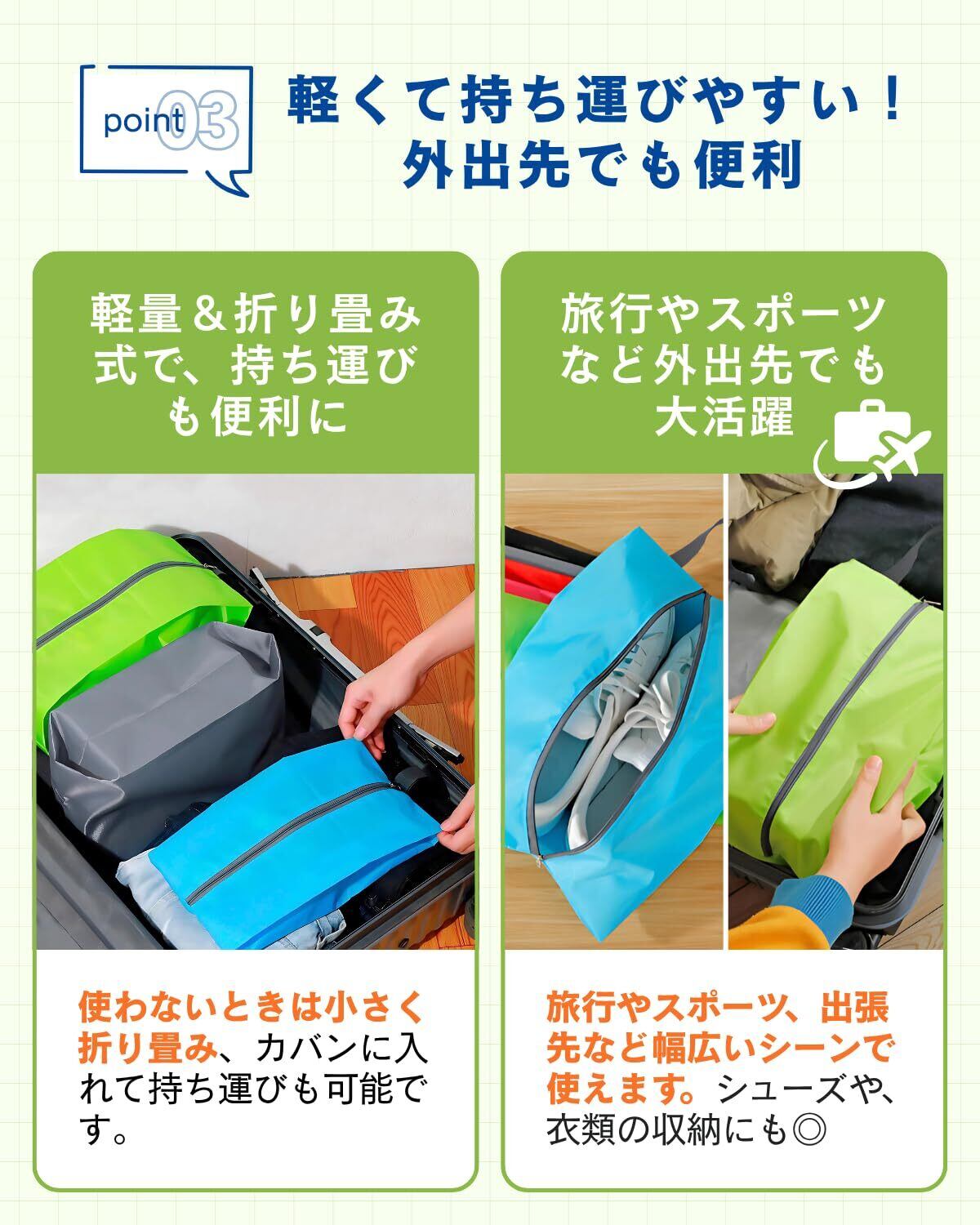 【持ち運びに便利なハンドル付き&軽量設計】しっかり握れるハンドル付きで、手持ちでも引っ掛けてもOK。軽量素材を使用しているため、通学や通勤バッグにも気軽に入れられます。スポーツクラブへの持参や旅行用のシューズ入れとしても大活躍。使わないときはコンパクトに折りたため、収納場所にも困りません。