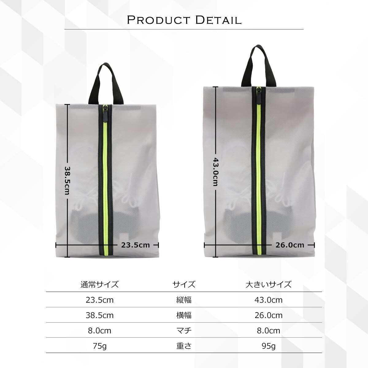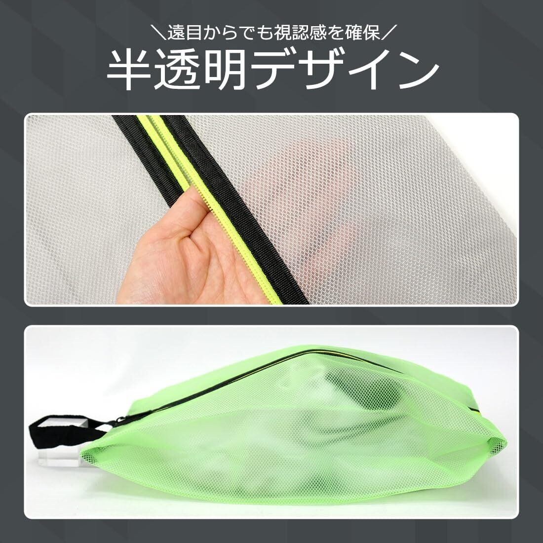 【防水・防塵のシューズケース】ポリエステルメッシュとTPU(熱可塑性ポリウレタン)の複合素材。軽量でありながら、優れた防水/防塵機能で、雨やホコリから大切な靴をしっかり守ります。