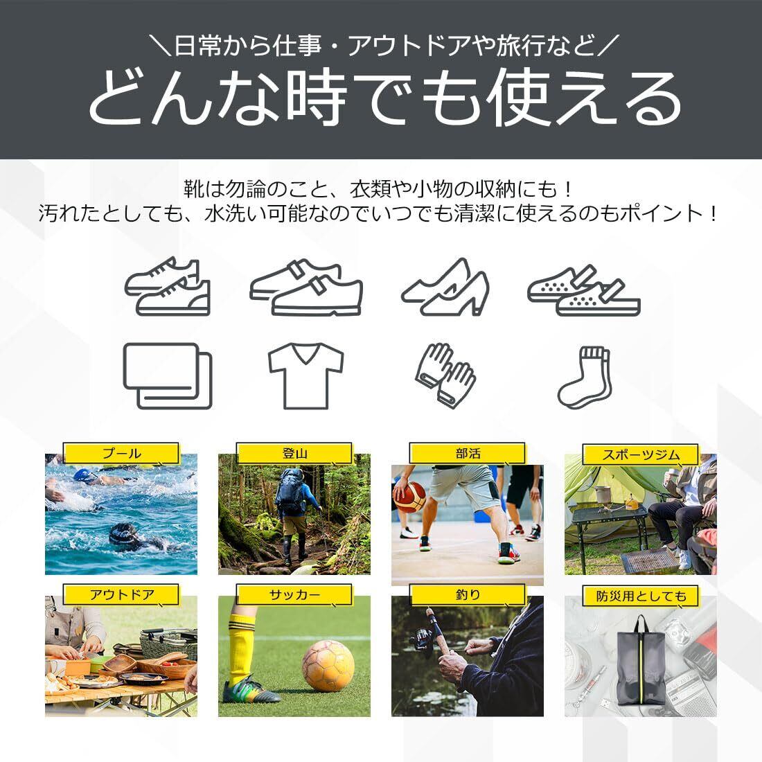 【多様なシーンで大活躍】旅行、出張、スポーツ、ジム、遠足、海水浴、キャンプなど、靴の収納・持ち運びに非常に便利です。また、靴だけでなく、衣類、家用の小物入れ、水着、濡れたタオル、洋服等の持ち運びにもお使い頂けます。【素材】 ポリエステル / TPU(熱可塑性ポリウレタン) 【生産国】 中国