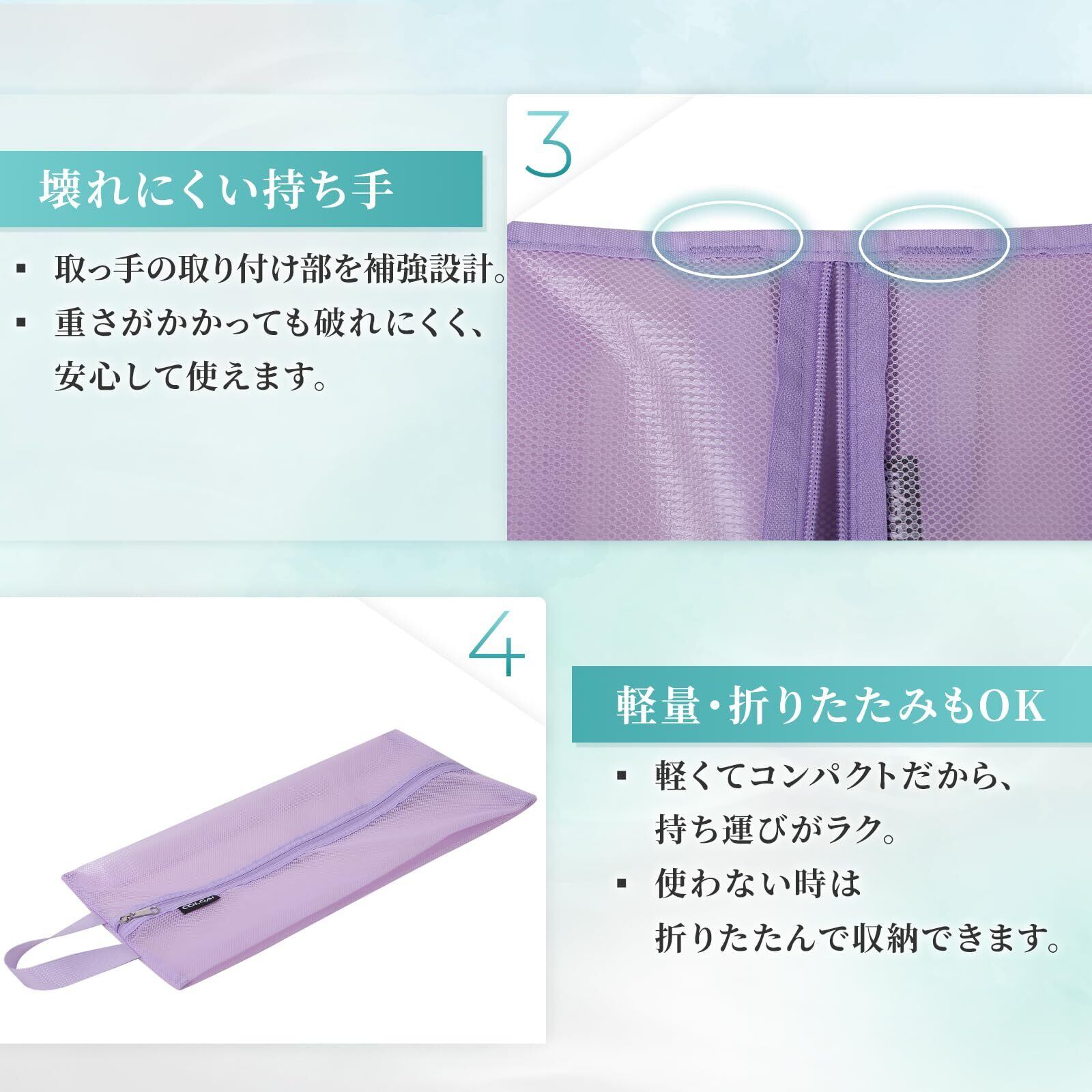 【メッシュ×TPUの2層構造で丈夫&清潔】 外側はポリエステルメッシュ、内側はTPUの2層構造。汚れや水分を閉じ込め、バッグの中を清潔に保ちます。薄く柔らかいTPUで靴の出し入れもスムーズ。(生地は水を通しませんが、防水ではありません。)