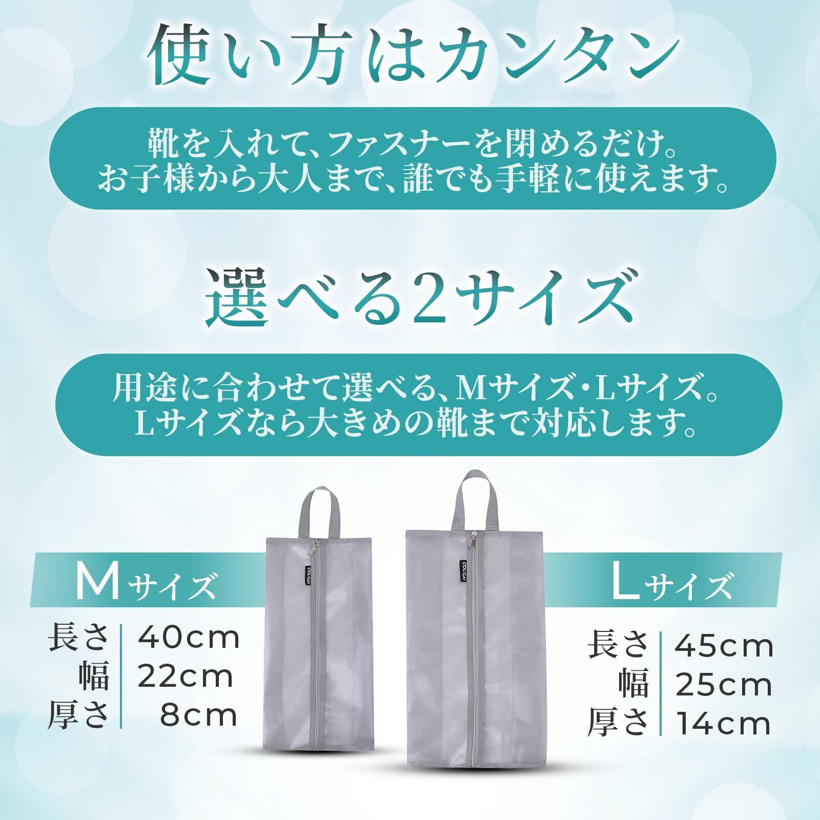 【選べる2サイズ&カラーバリエーション】 Mサイズ・Lサイズの2サイズ展開。用途や靴の大きさに合わせて選べます。ブラック/グレー/ブルー/ラベンダー(※Lサイズはブラック・グレーのみ)。家族で色分けして使うのもおすすめです。