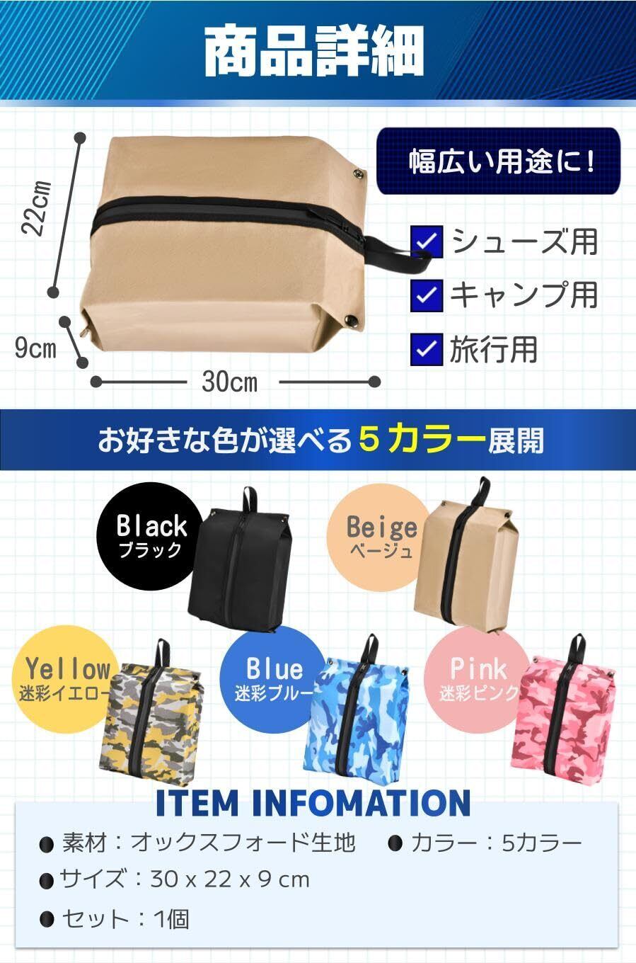 【商品詳細】素材:オックスフォード生地カラー:5カラー/サイズ:30 x 22 x 9 cm/セット:1個/