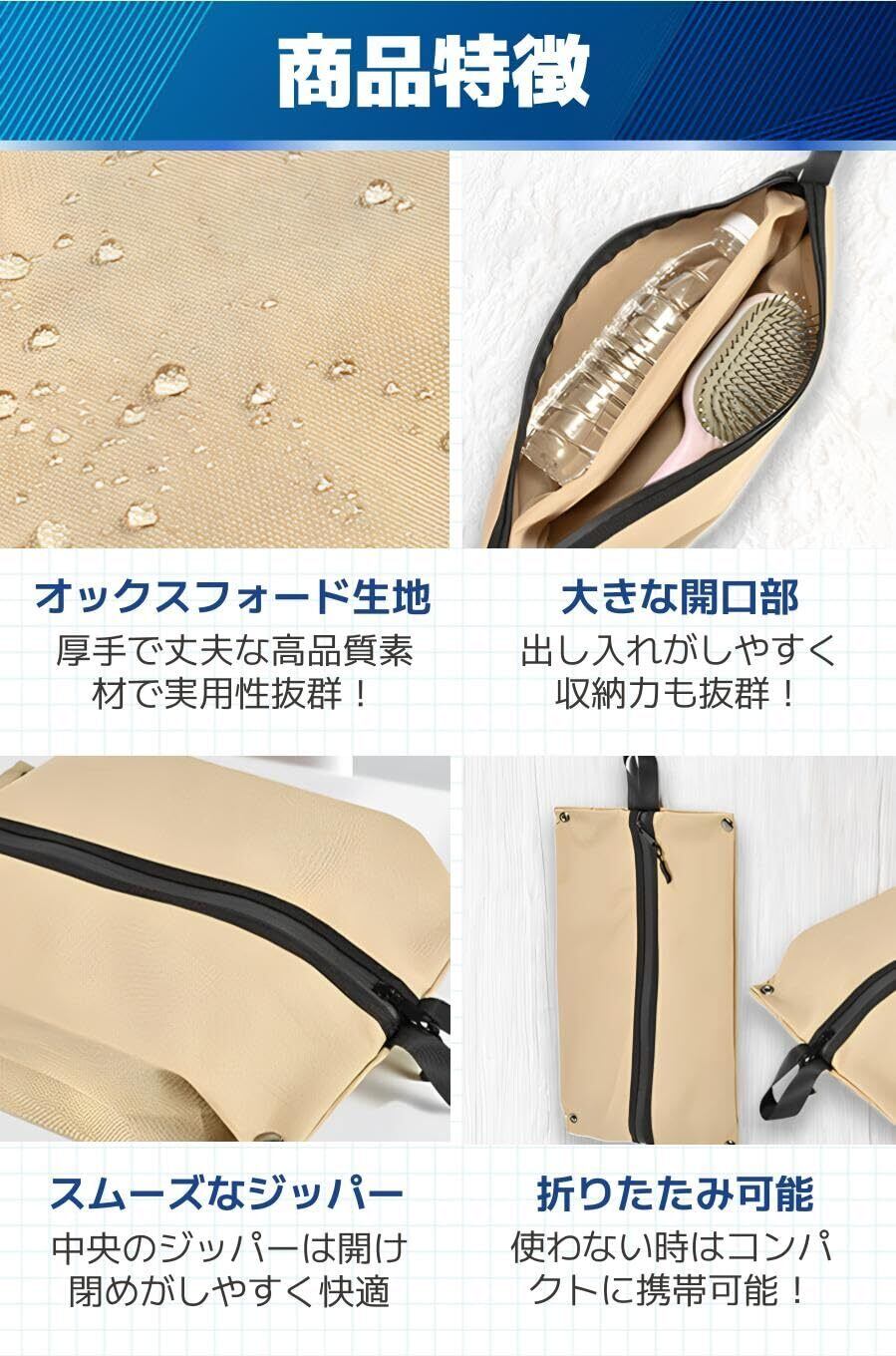 【商品特徴】①オックスフォード生地:厚手で丈夫な高品質素材で実用性抜群!/②大きな開口部:出し入れがしやすく収納力も抜群!/③スムーズなジッパー:中央のジッパーは開け閉めがしやすく快適/④折りたたみ可能:使わない時はコンパクトに携帯可能!