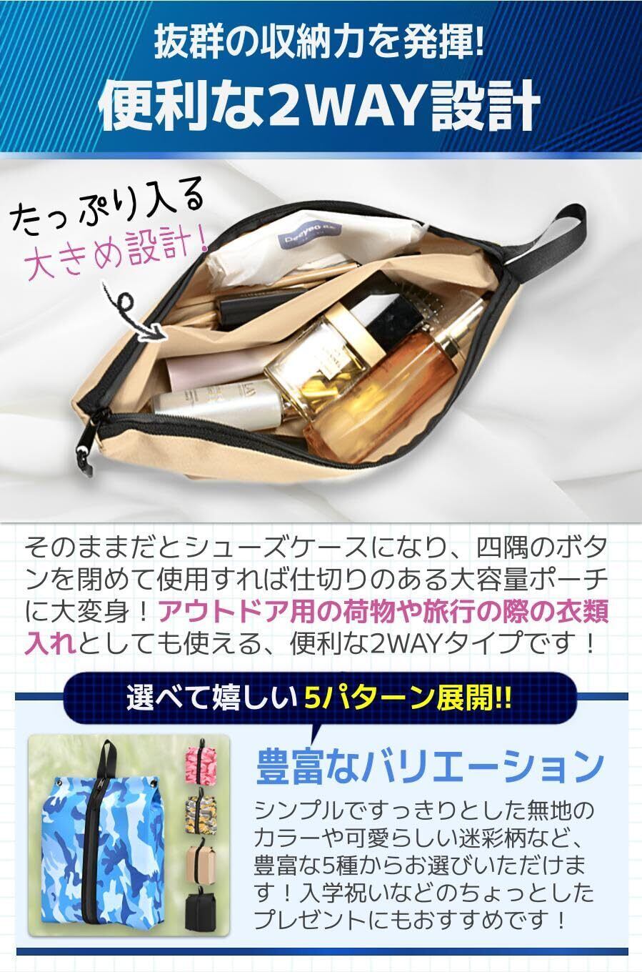 【便利な2WAY設計】そのままだとシューズケースになり、四隅のボタンを閉めて使用すれば仕切りのある大容量ポーチに大変身!アウトドア用の荷物や旅行の際の衣類入れとしても使える、便利な2WAYタイプです!