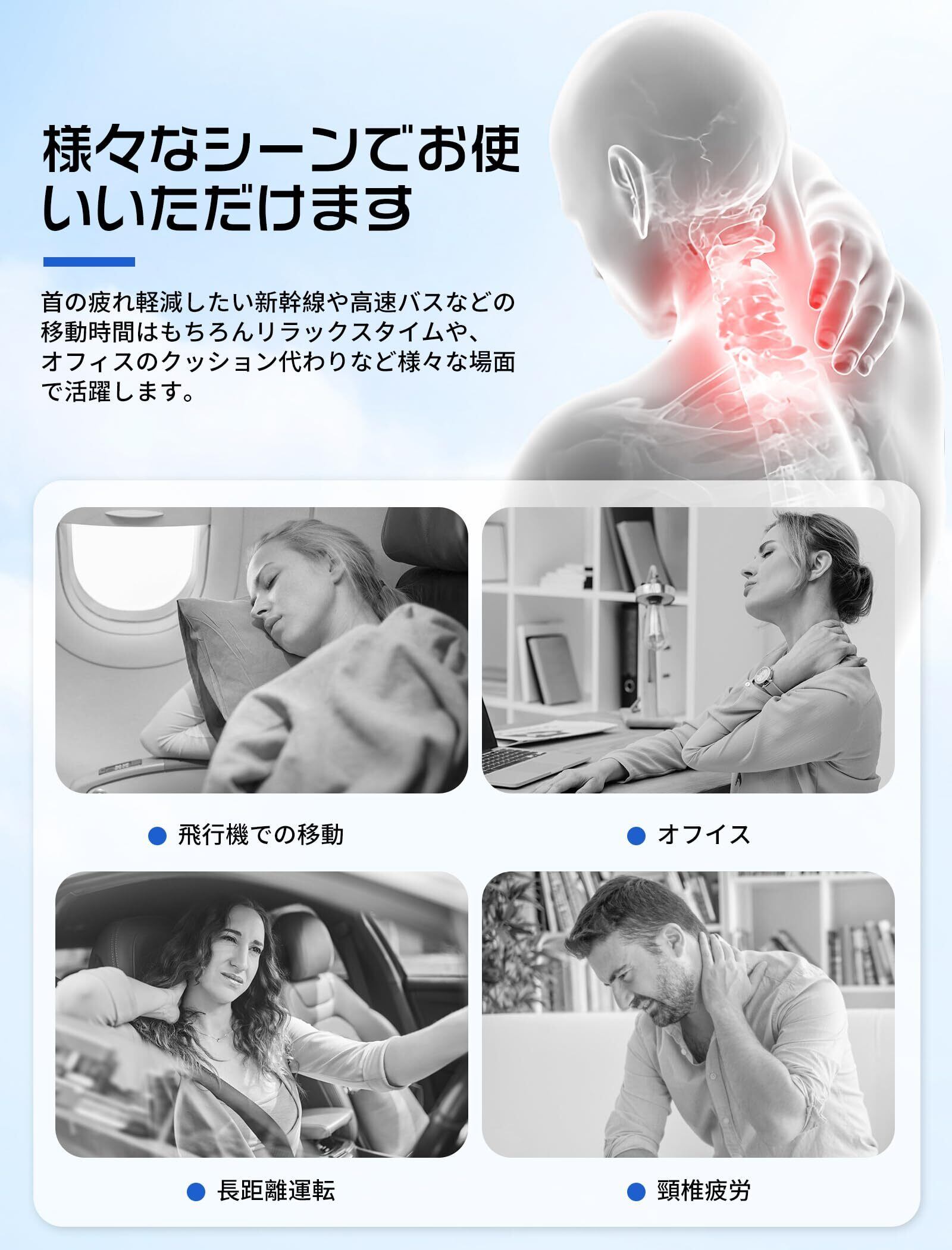 【あらゆる場面で活躍】旅行時の飛行機、長距離バス、新幹線ではもちろん、仕事の合間のお昼寝や家でのリラックスタイムでもお使いいただけます。車シートや椅子の背もたれ用クッションとしても使え、オフィスや旅行中でも、ゆったりとした気分を味わえます。自分用や、プレゼントとして家族や友人に差し上げるといいでしょう。
