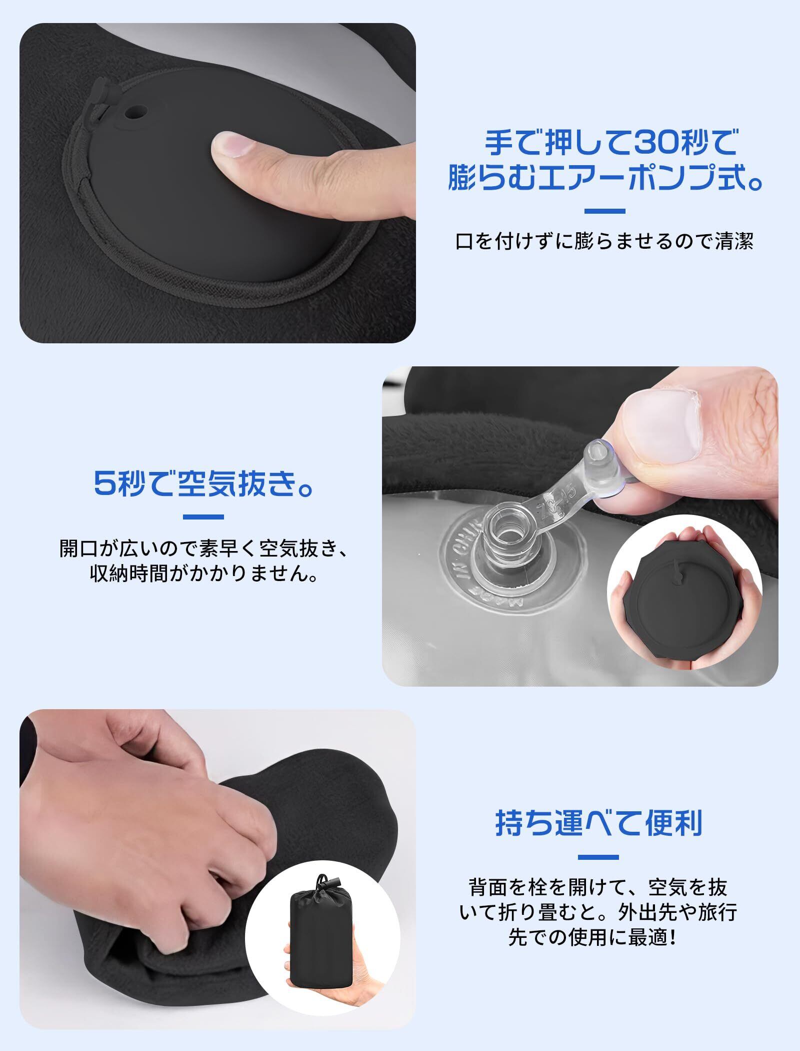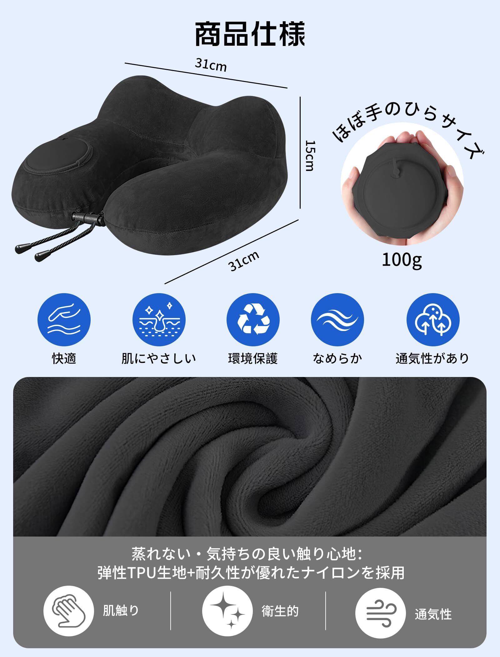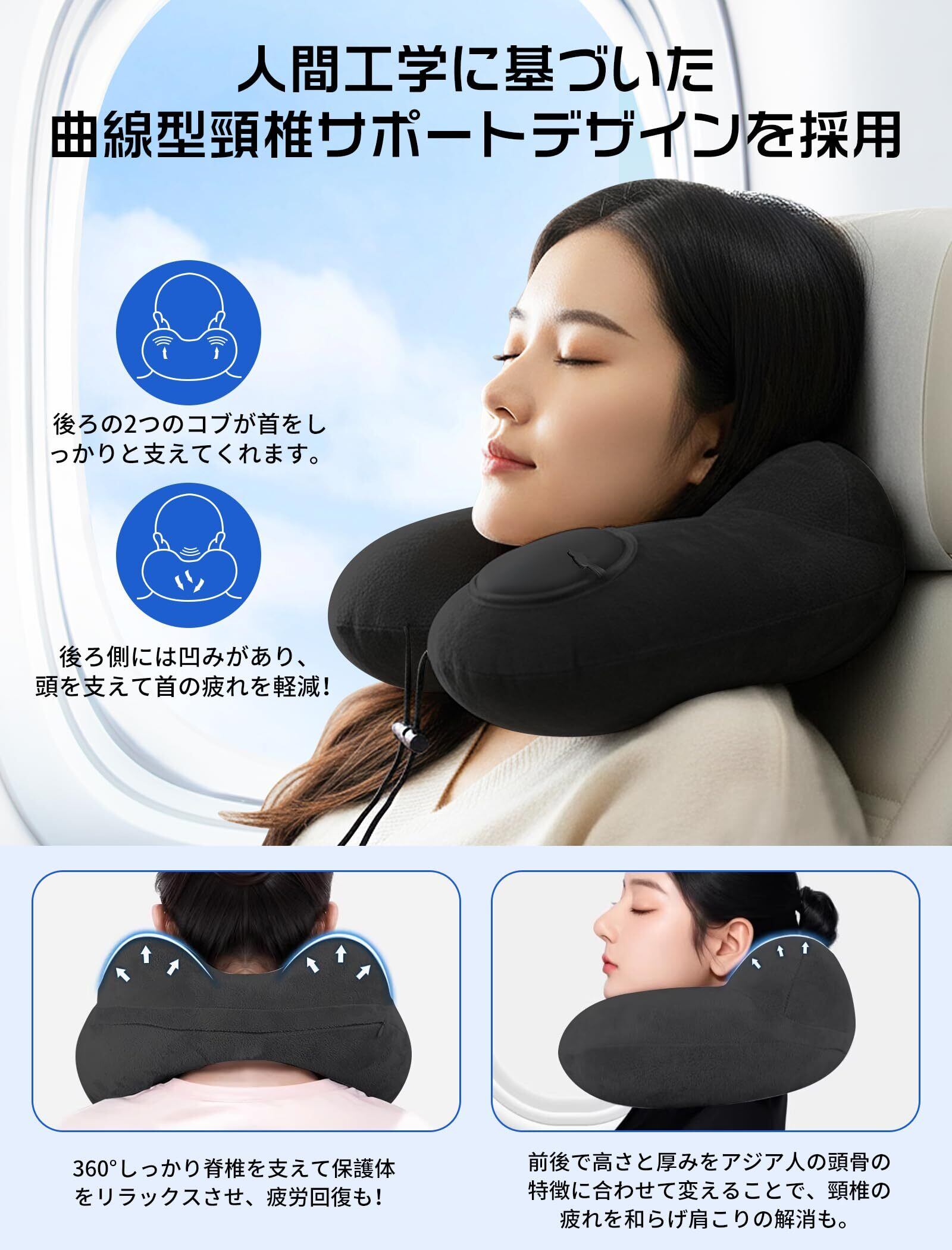携帯枕 ネックピロー 首枕 U型 空気枕 持ち運び便利 旅行枕 収納ポーチ付き 洗えるカバー 飛行機 コンパクト 車 夜行深夜バス 新幹線 ソファ 旅行用最適 (ブラック)