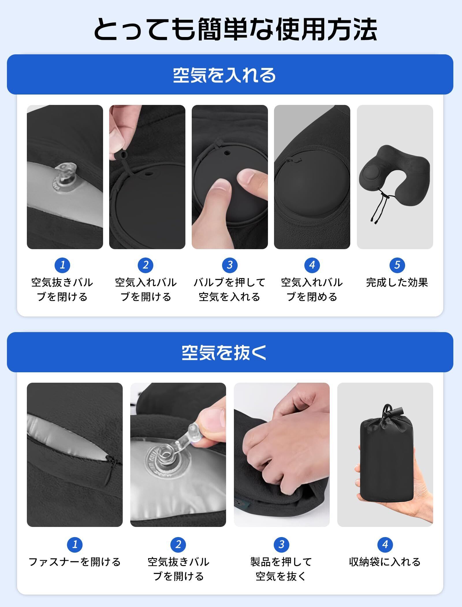 【特価セール】携帯枕 ネックピロー 首枕 U型 空気枕 持ち運び便利 旅行枕 収納ポーチ付き 洗えるカバー 飛行機 コンパクト 車 夜行深夜バス 新幹線 ソファ 旅行用最適 (ブラック)
