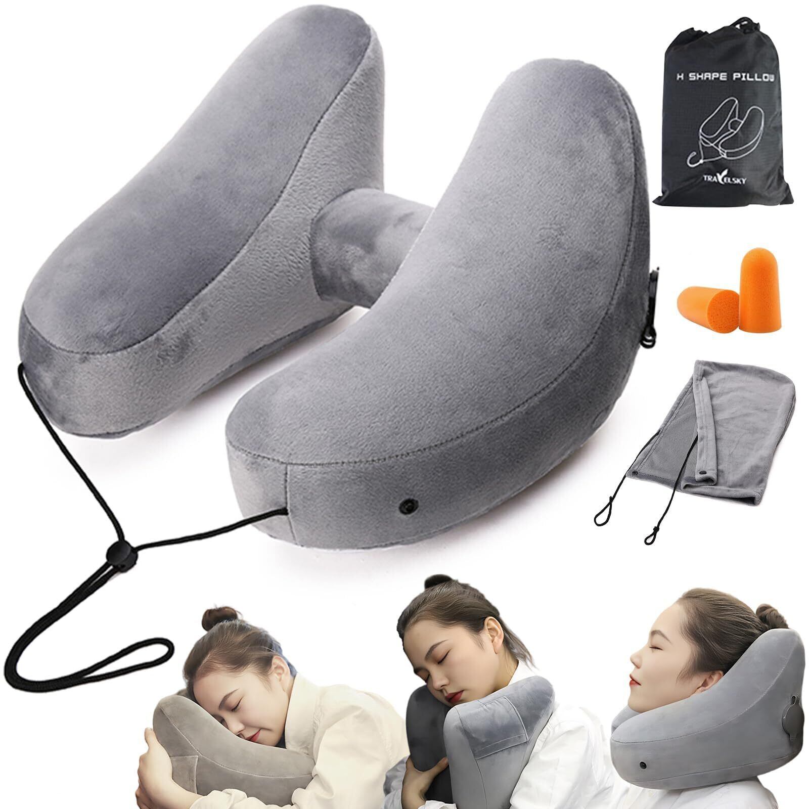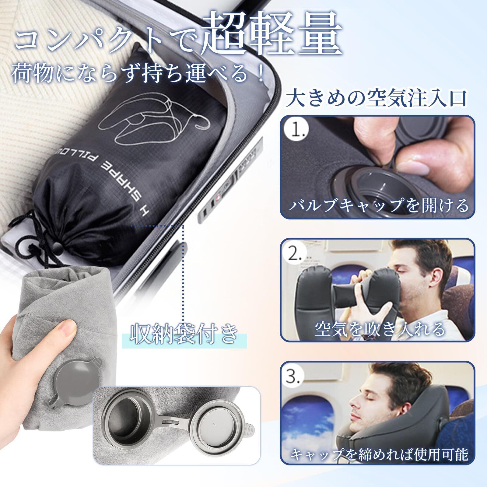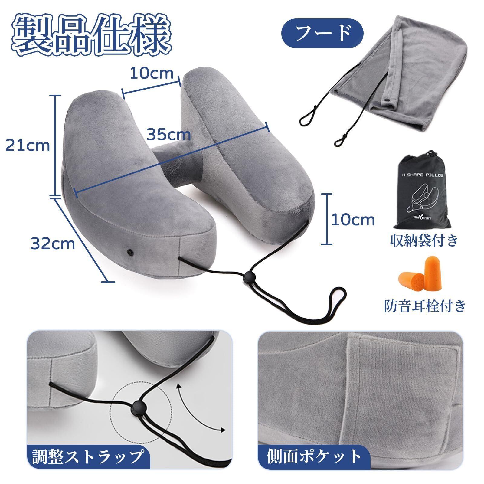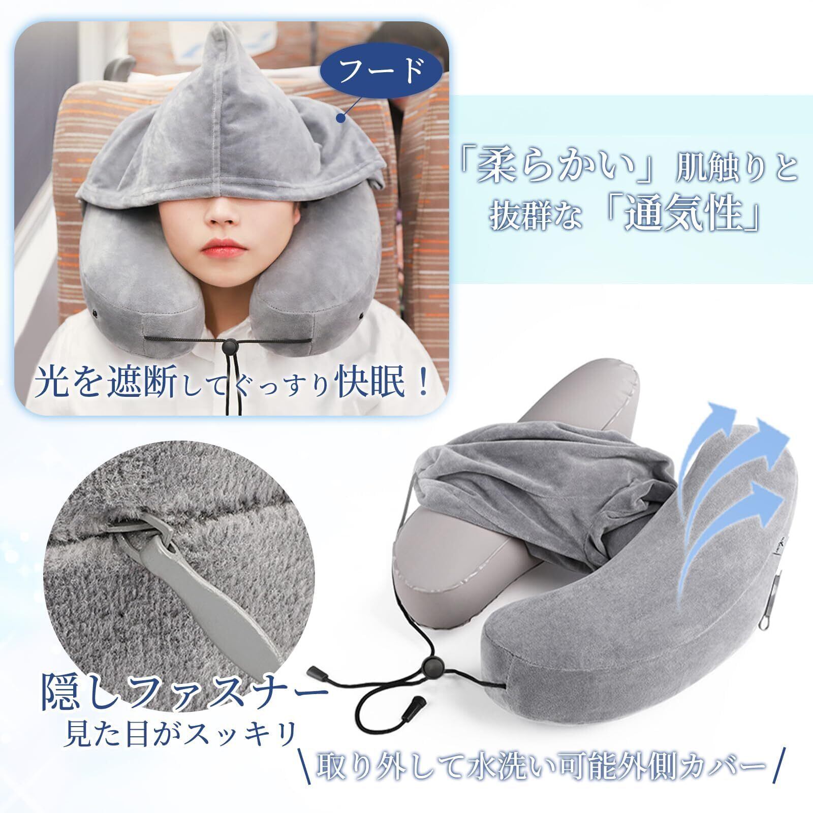 【2022最新】ネックピロー 飛行機 H型 トラブル枕 車 新幹線 首枕 首が痛くならない 車 夜行バス 低反発 クッション 超軽量 トラベルピロー 旅行 エアーピロー フード付き 空気枕 仮眠 快眠ピロー オフィス/出張/新幹線/飛行機/夜行バス 携帯枕 旅行グッズ コンパクト 収納バッグ付き (グレー)