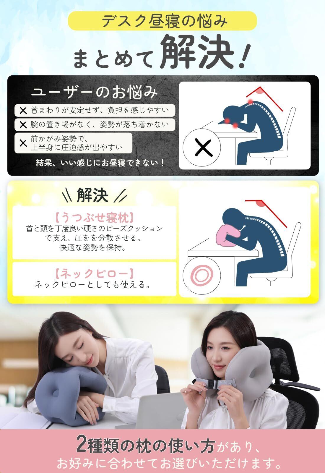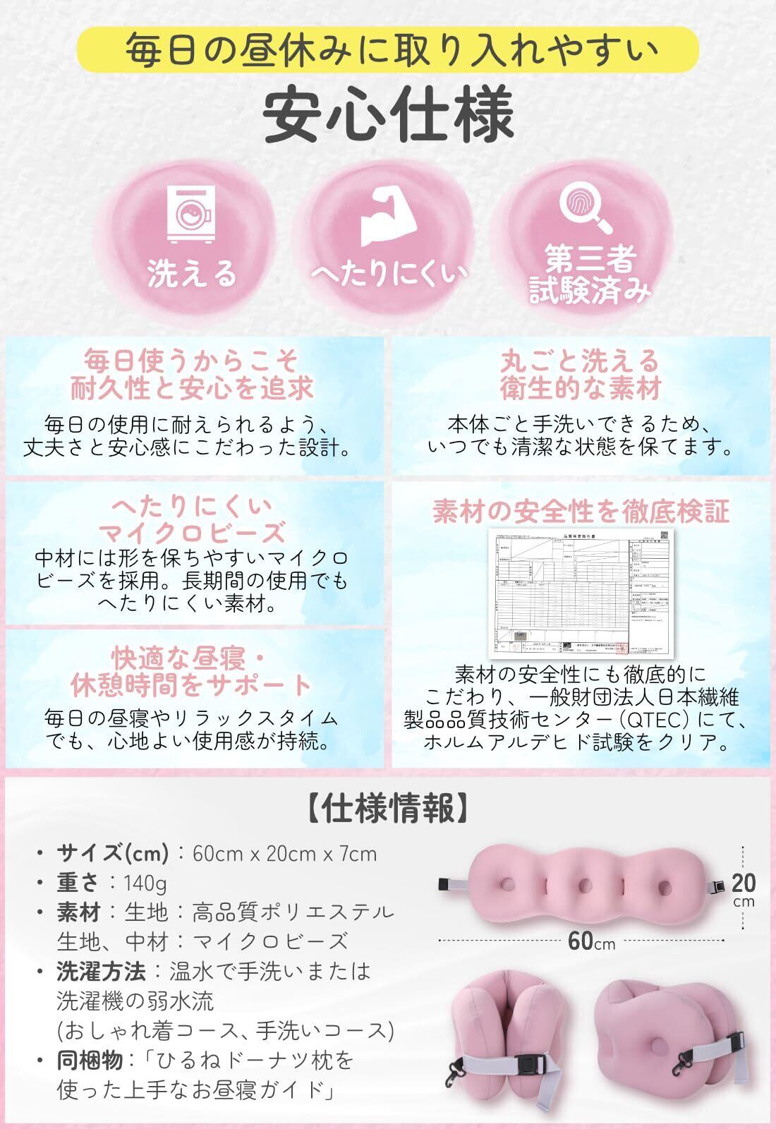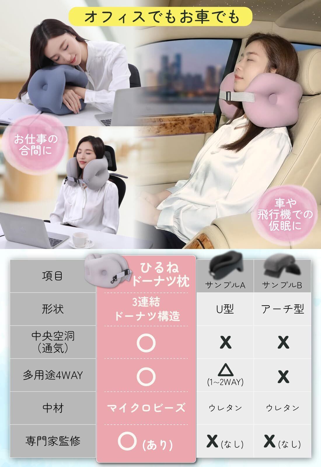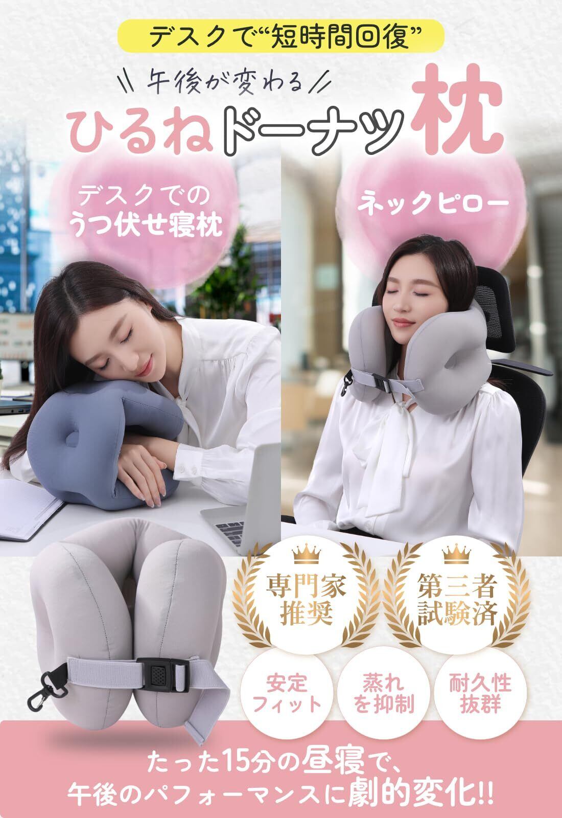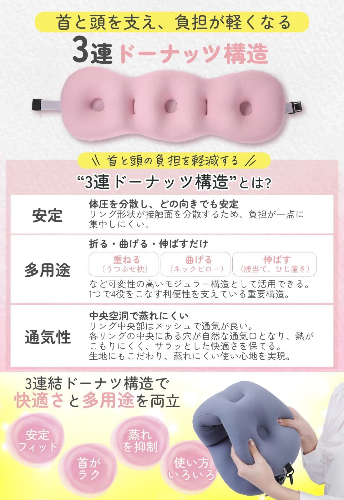 昼寝や仮眠に使いやすい、3連ドーナツ構造を採用した昼寝枕です。短時間の休憩でも姿勢が安定しやすい設計です。