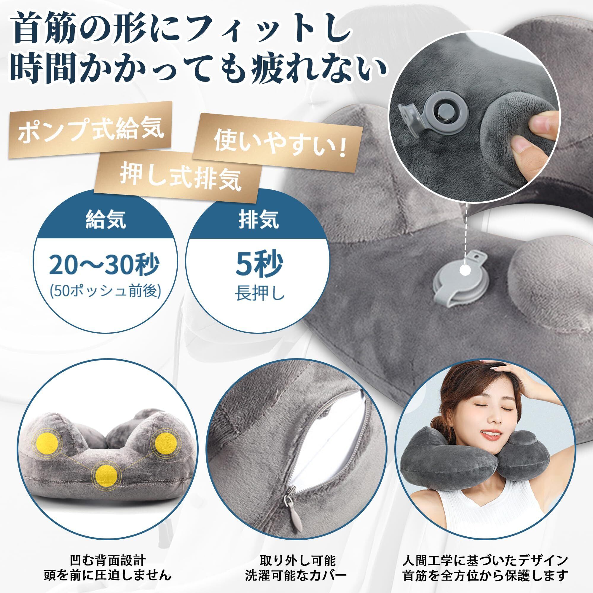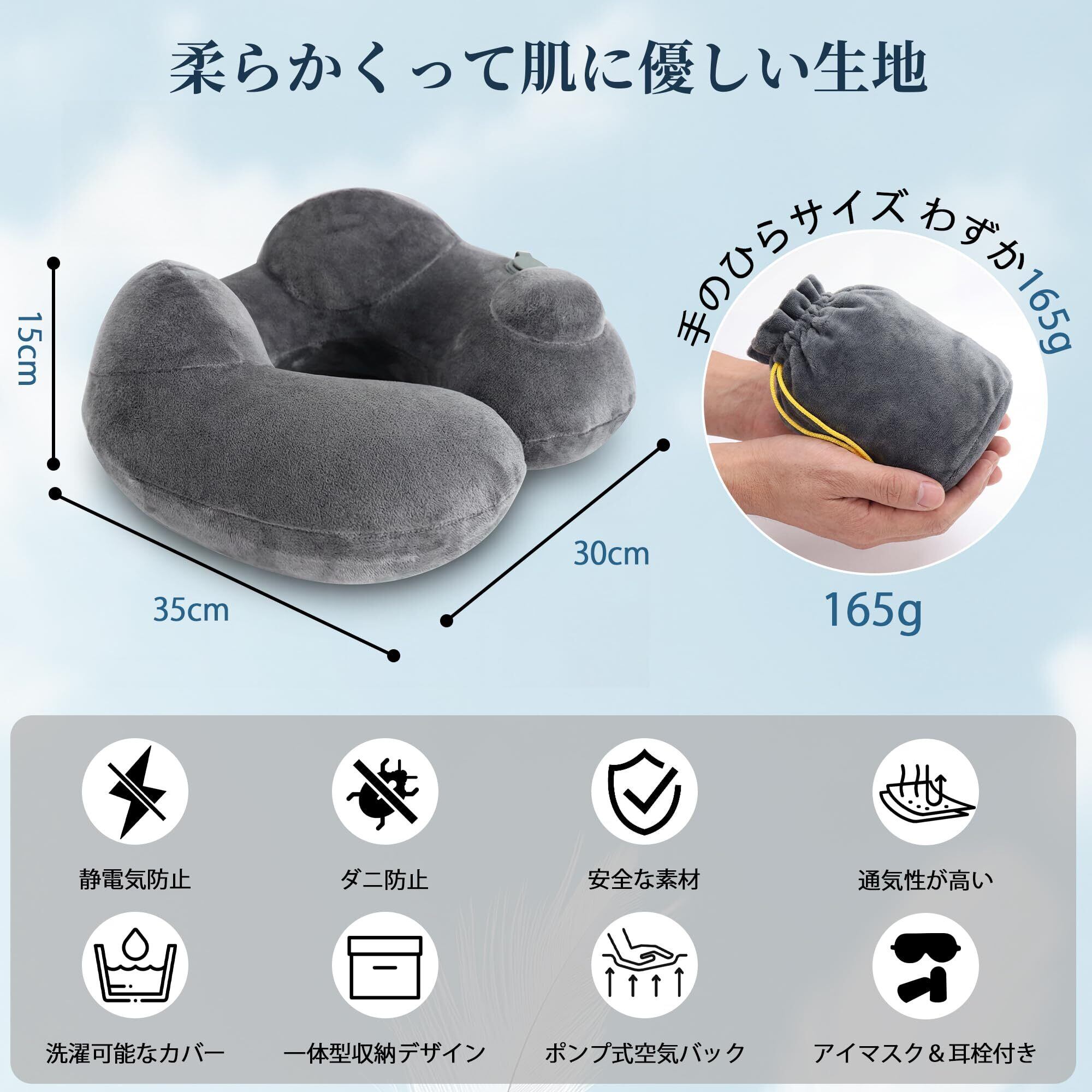 【収納簡単&品質】重量はわずか165g。片手にすっぽり収まるコンパクトサイズで、携帯性は抜群。長時間の飛行機や新幹線、ドライブ中にも最適です。収納袋・アイマスク・耳栓付きで、いつでもどこでも安眠をサポート。素早くたたんで持ち運べ、荷物の負担を増やさない便利なネックピローです。※万が一製品に不具合がある場合は、お気軽にお問い合わせください。24時間以内にご返信いたします。問題が確認された場合、返金または交換に対応いたします。