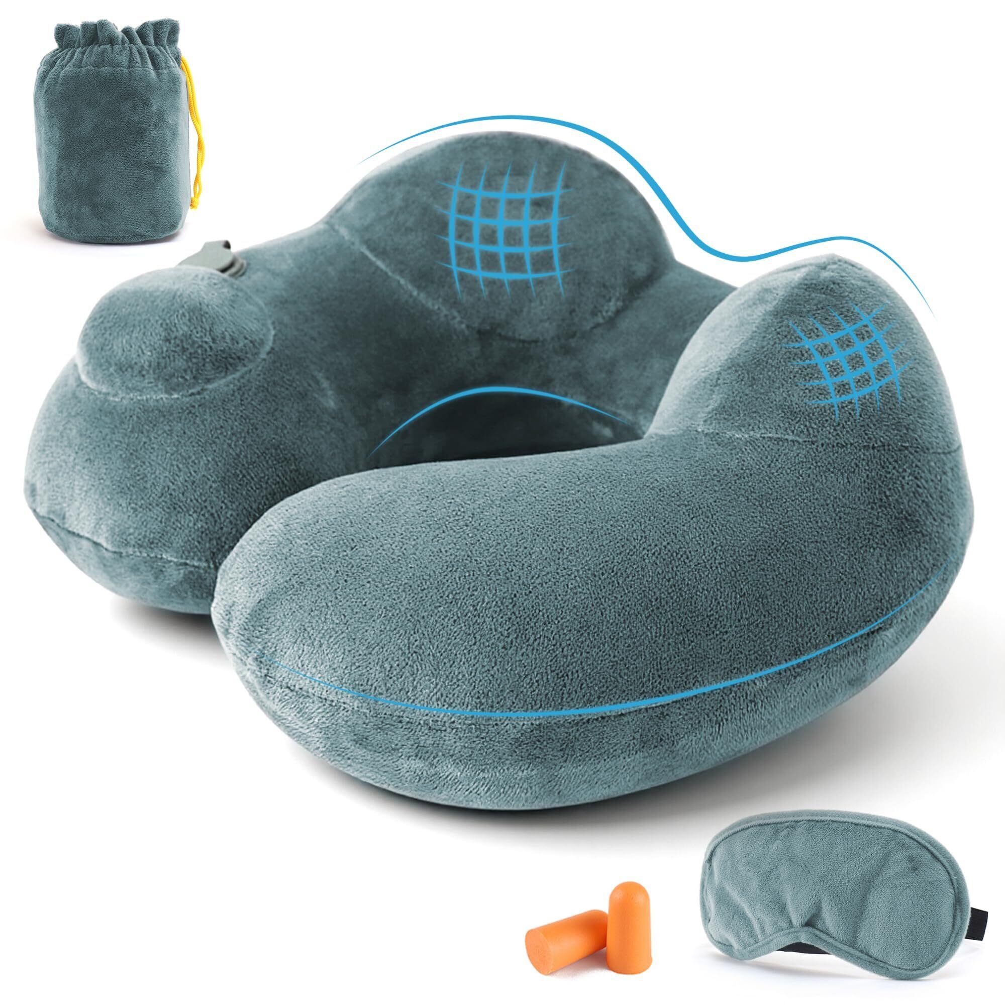 ネックピロー 首枕 旅行用 ポンプ式 空気枕 コンパクト エアーピロー 飛行機 快適グッズ 携帯枕 軽量 持ち運び 折り畳み 旅行 便利グッズ オフィスグッズ 収納バッグ付き 耳栓付き アイマスク付き トラベル U型 誕生日 クリスマス プレゼント 最適 グリーン