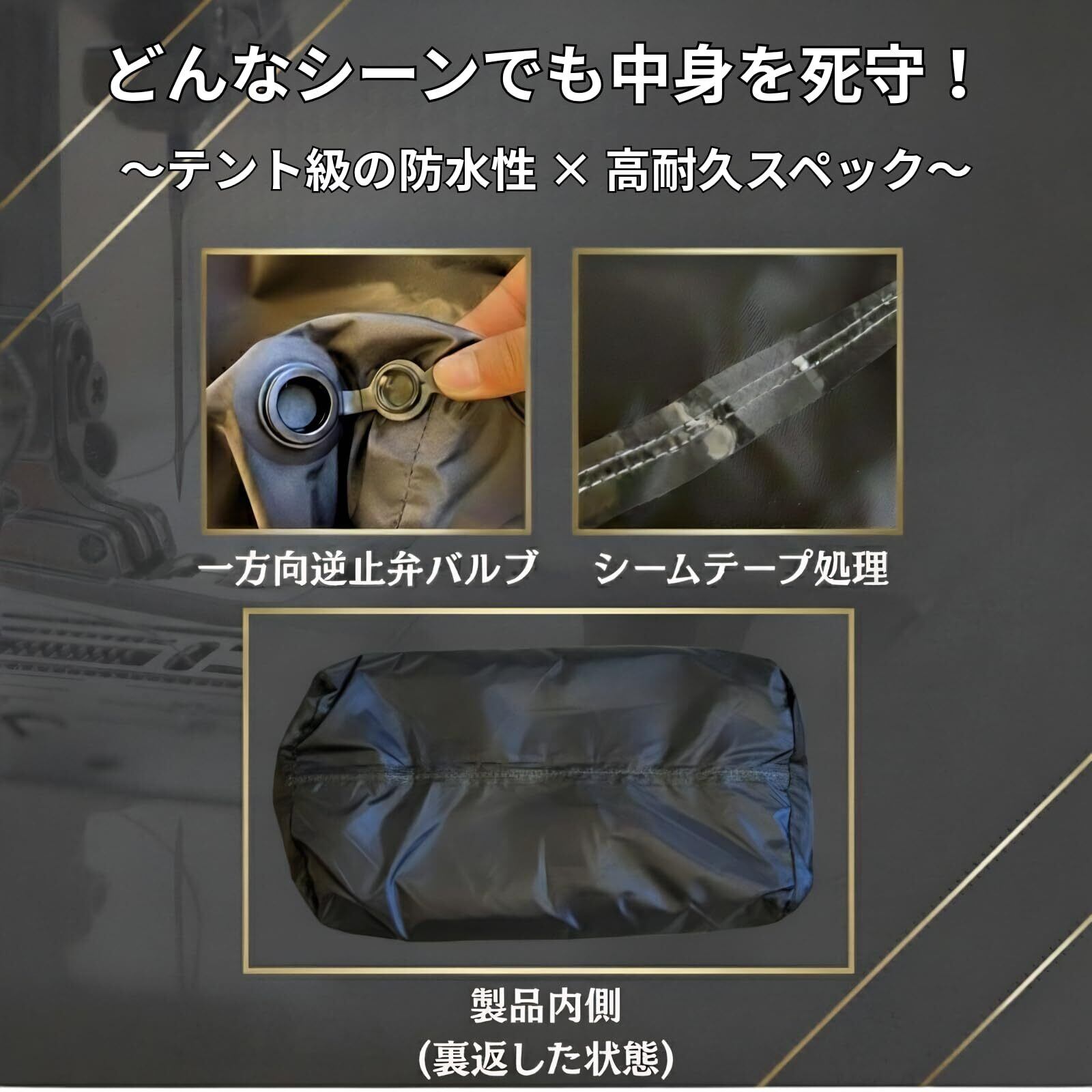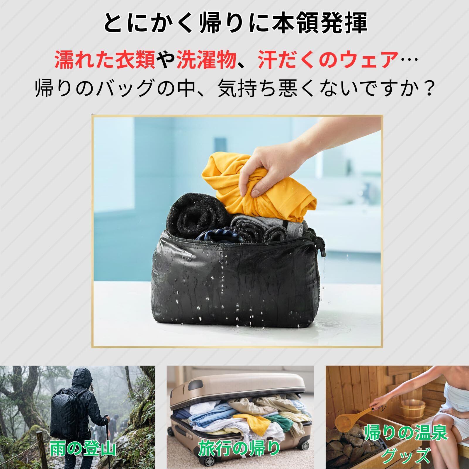 【濡れたテントや温泉グッズの隔離に】 完全防水・防塵設計なので、圧縮だけでなく「濡れたモノの持ち帰り」にも本領を発揮します。キャンプ帰りの朝露で濡れたタープやシート、泥だらけのウェア、下山後の温泉・サウナグッズをそのまま入れて他の荷物から隔離し、快適に持ち帰ることができます。