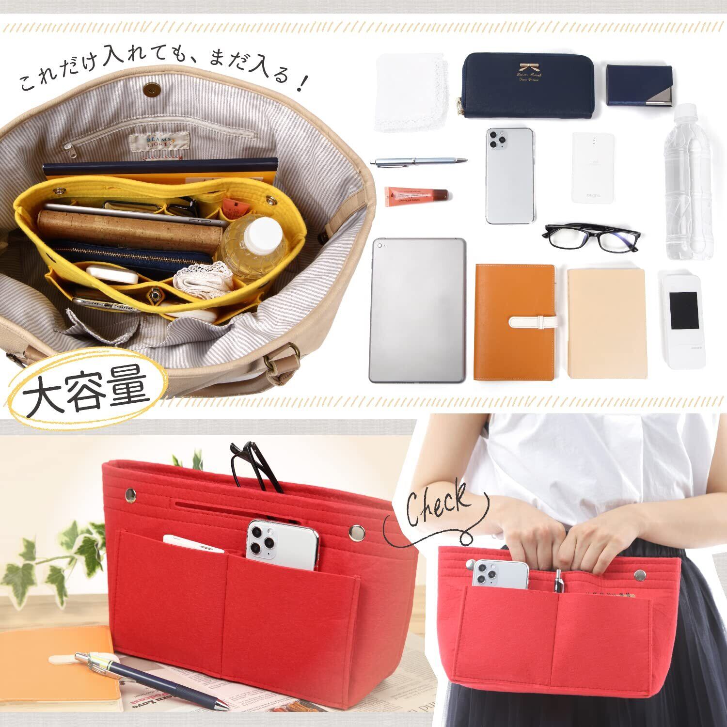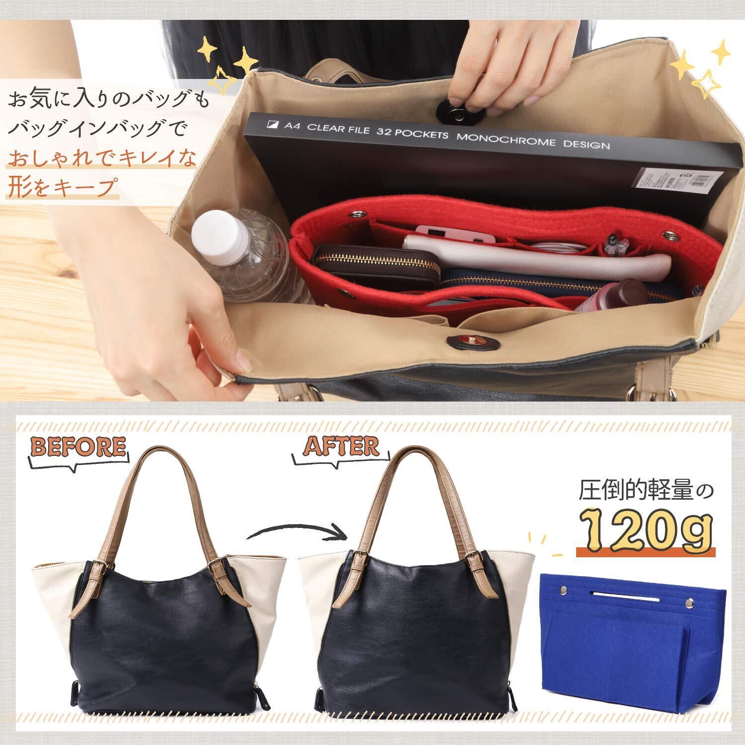 VILAU バッグインバッグ 底板付き トートバッグ用 インナーバッグ レディース フェルト 軽量 グレージュ