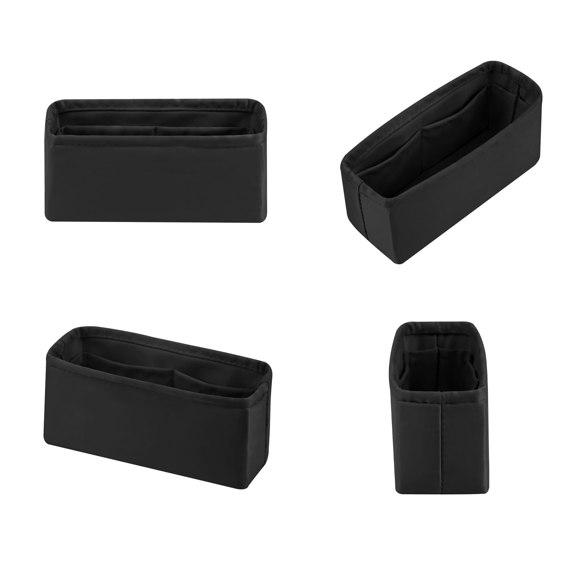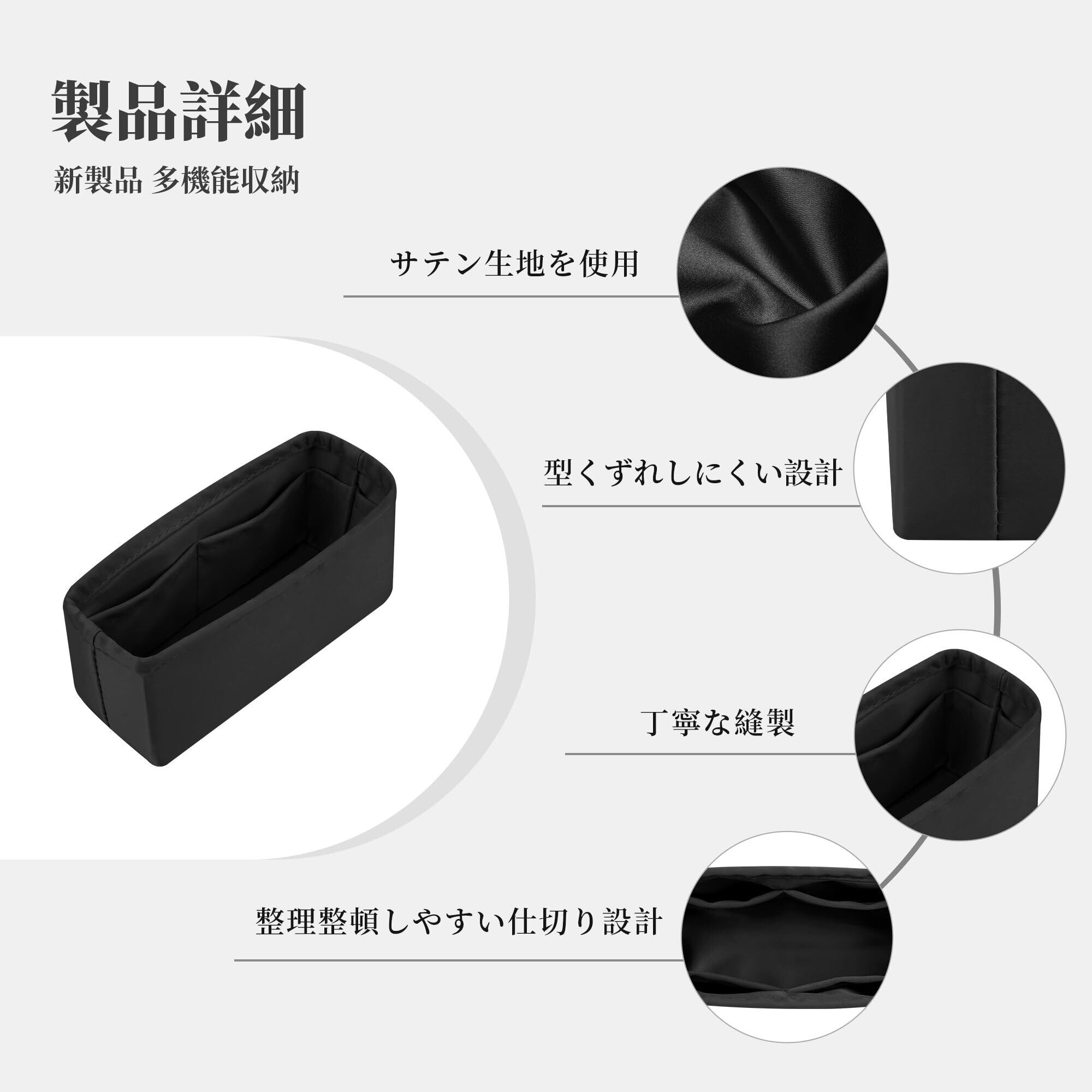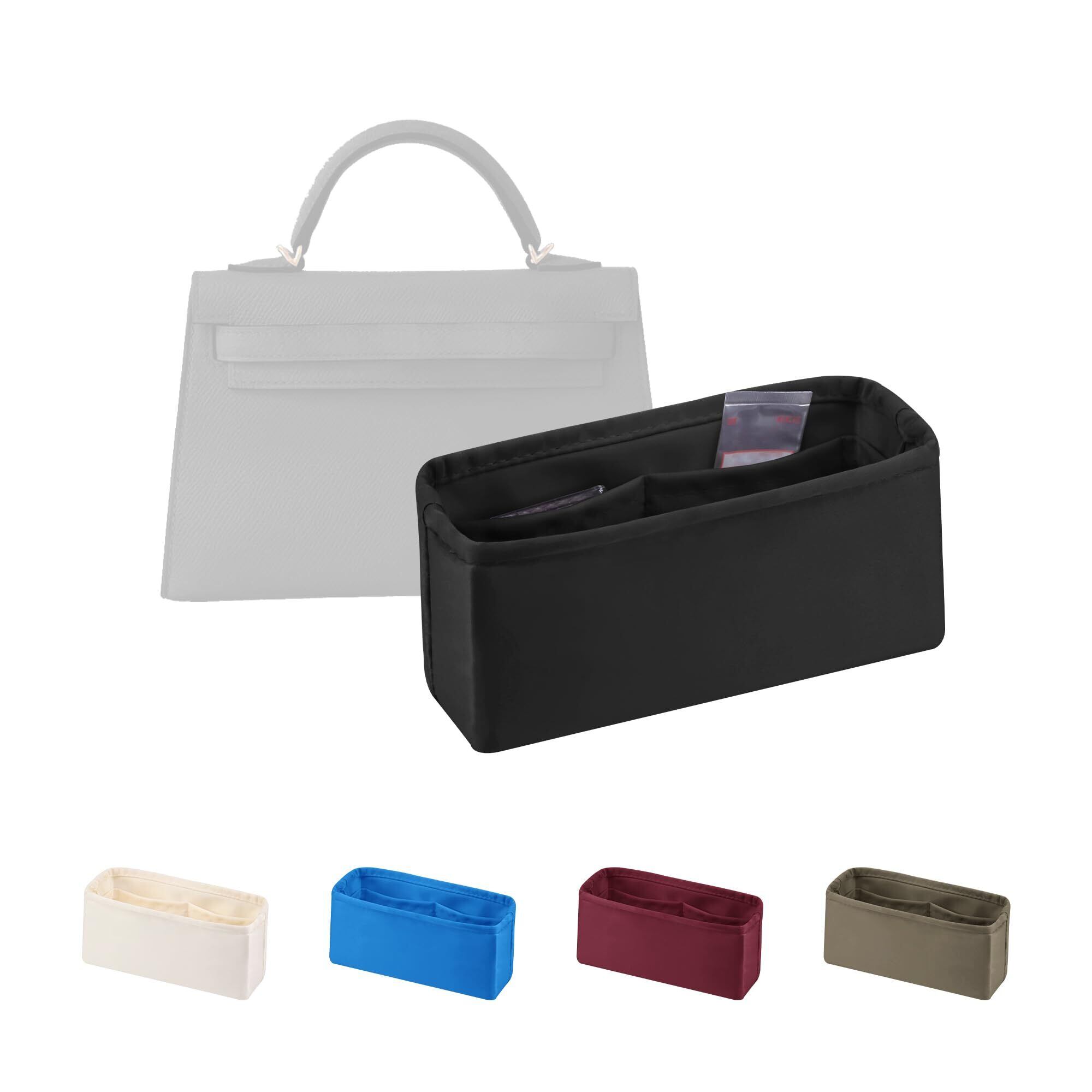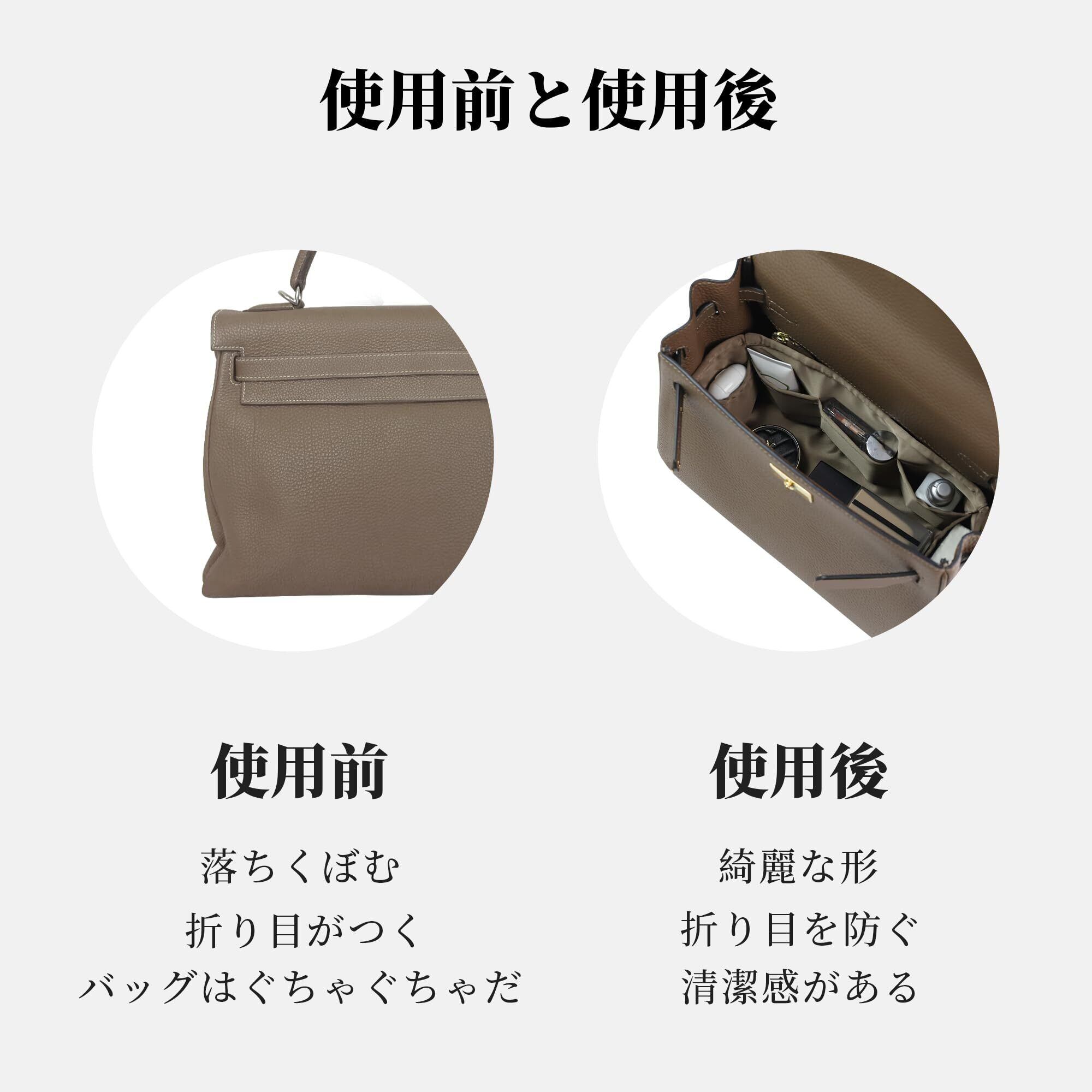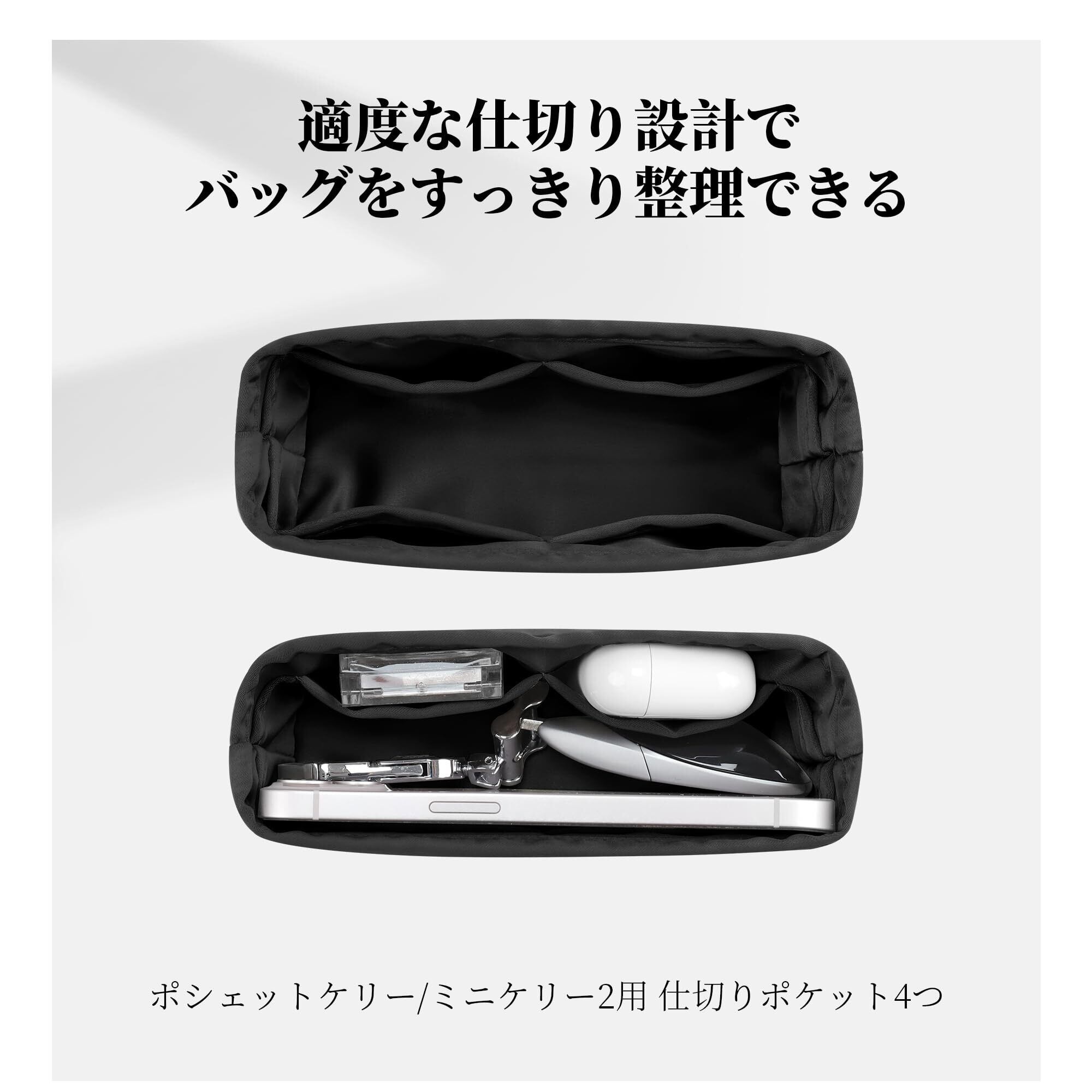 【特価セール】サテン インナーバッグ エルメス適用 小さめ 軽量 自立 カバン整理収納 型崩れ防止 仕切りポケット付き(ブラック, ケリーミニ2用)