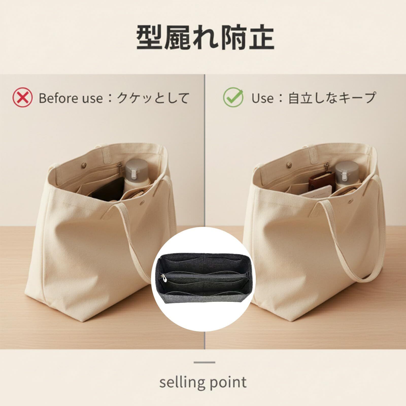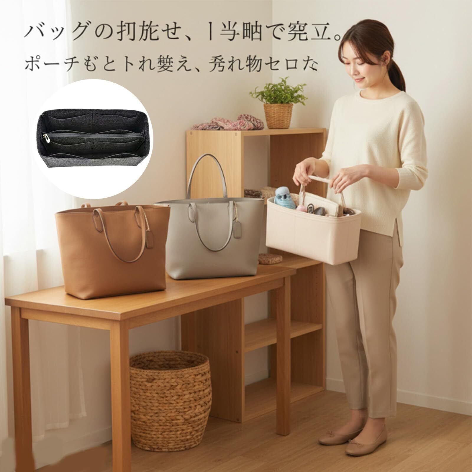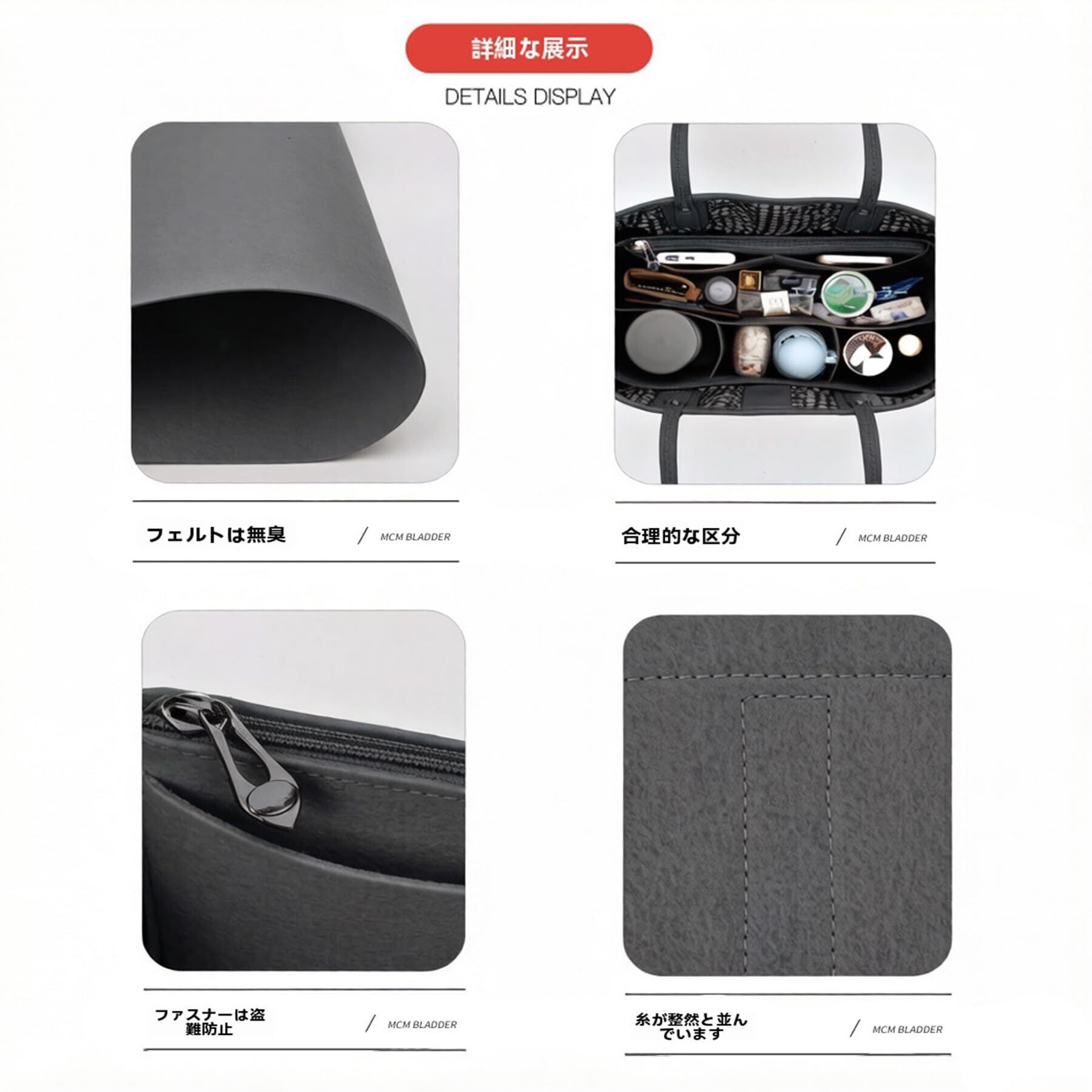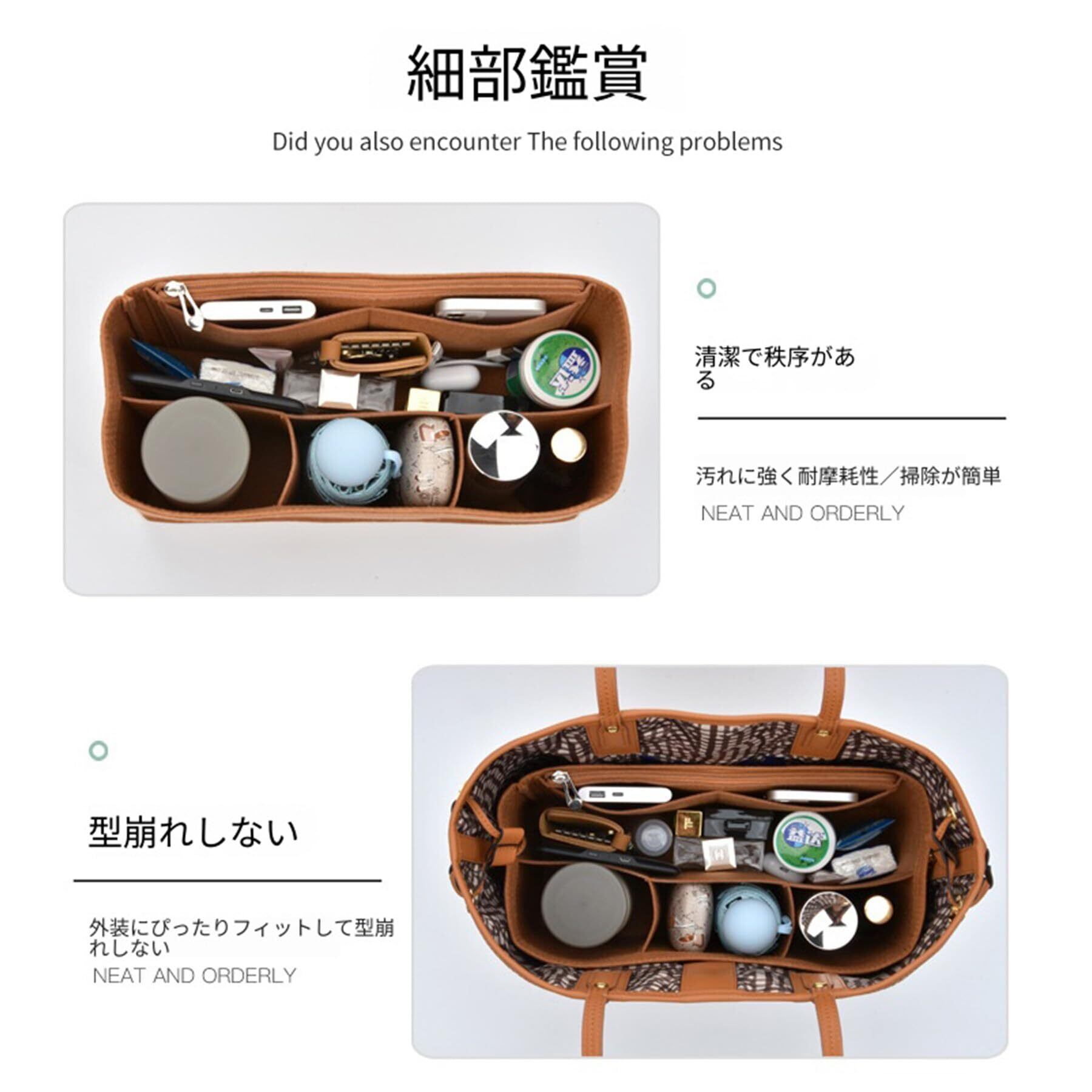 柔らかく滑りの良いフェルト素材を使用しているため、内側のバッグを擦り傷から保護します。高級トートバッグや皮革製品にも安心してお使いいただけます。