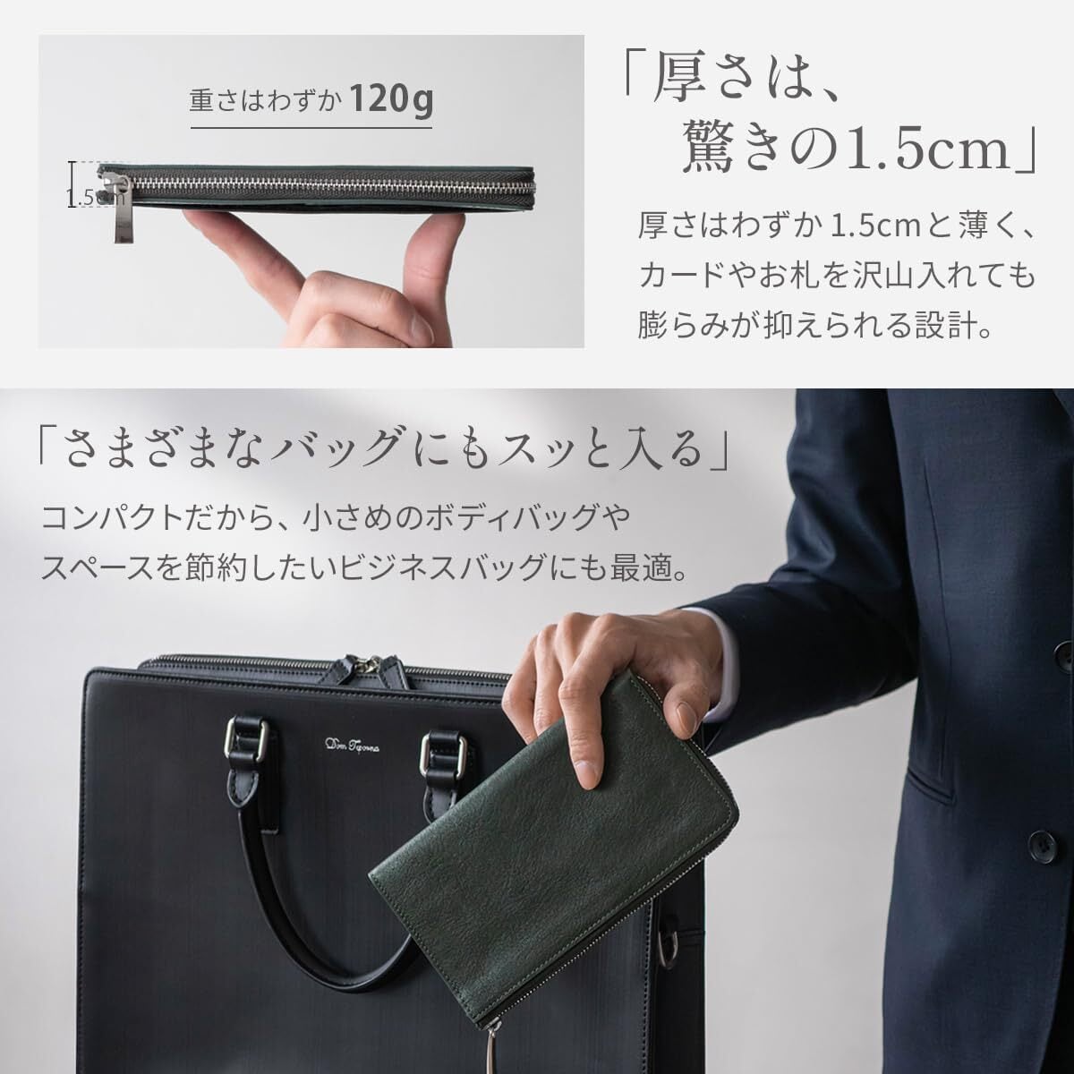 【スペック】 ・小銭入れ × 1 ・フリースペース × 2 ・カードポケット × 16 ・フリーポケット × 2 ・外ポケット × 1 【サイズ】 ・縦 100mm × 横 180mm × 厚み 15mm ・重さ 120g 【素材】 ・表側:本革 イタリアンレザー ・内側:ナイロン/PUレザー