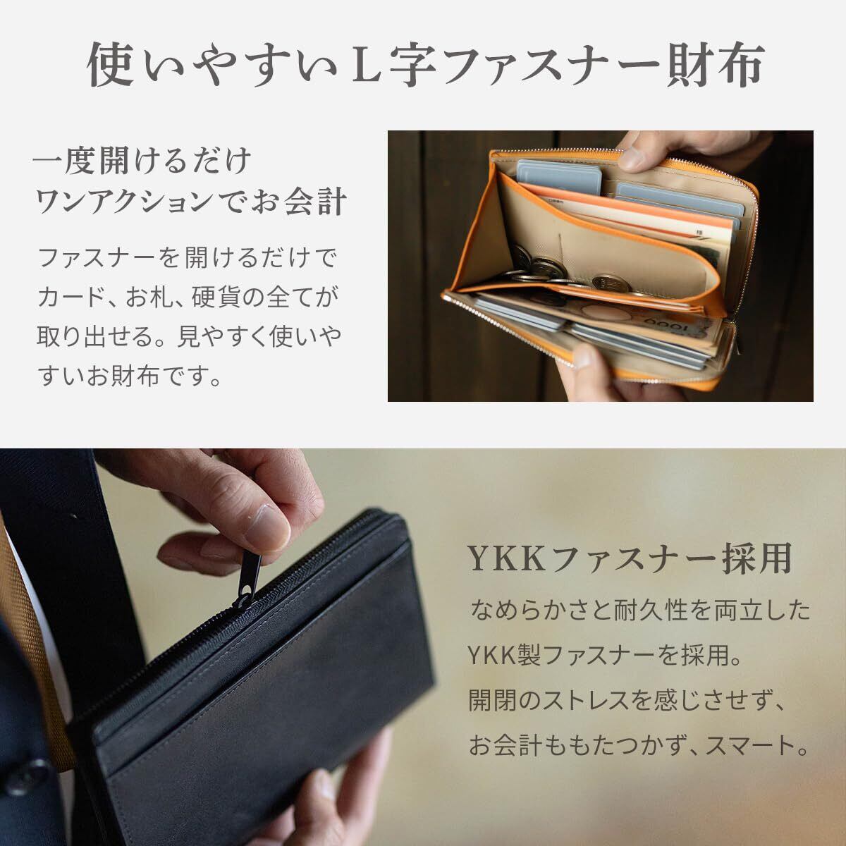 【素材にもこだわり】 表地には伝統的な製法で仕上げられた本革イタリアンレザーを使用しました。上質な手触りと、使うほどに艶と色味が深まるエイジングをお楽しみください。ファスナーは滑らかで耐久性に優れたYKK製です。