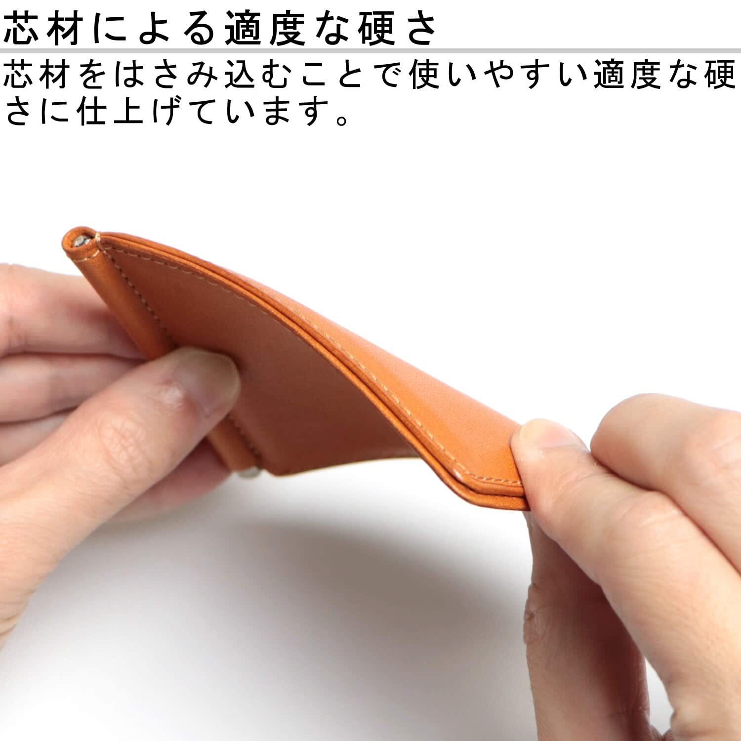カード段がないことでお札(万札)を二つ折りにしたサイズに合わせることができ、一般的なカードの入る札ばさみよりも圧倒的な小ささと薄さを実現しました。