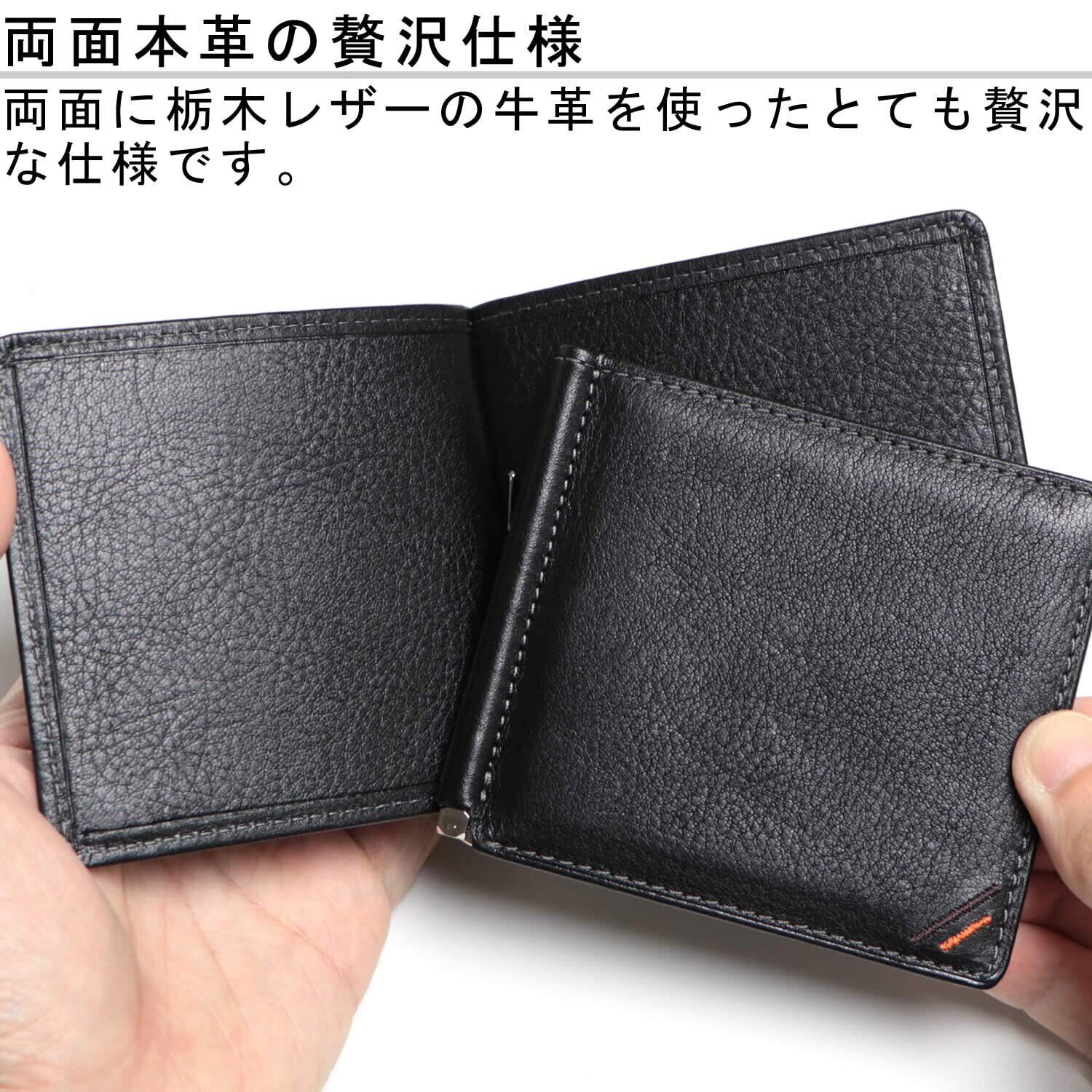 革は両面とも栃木レザーの牛革を使用し、シンプルながらとても高級感のある仕上がりです。普段からカードを使わない方や、電子マネー使用で現金は緊急時用に最小限持ち歩きたい方におすすめの札ばさみです。