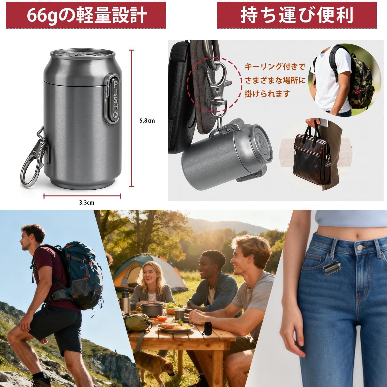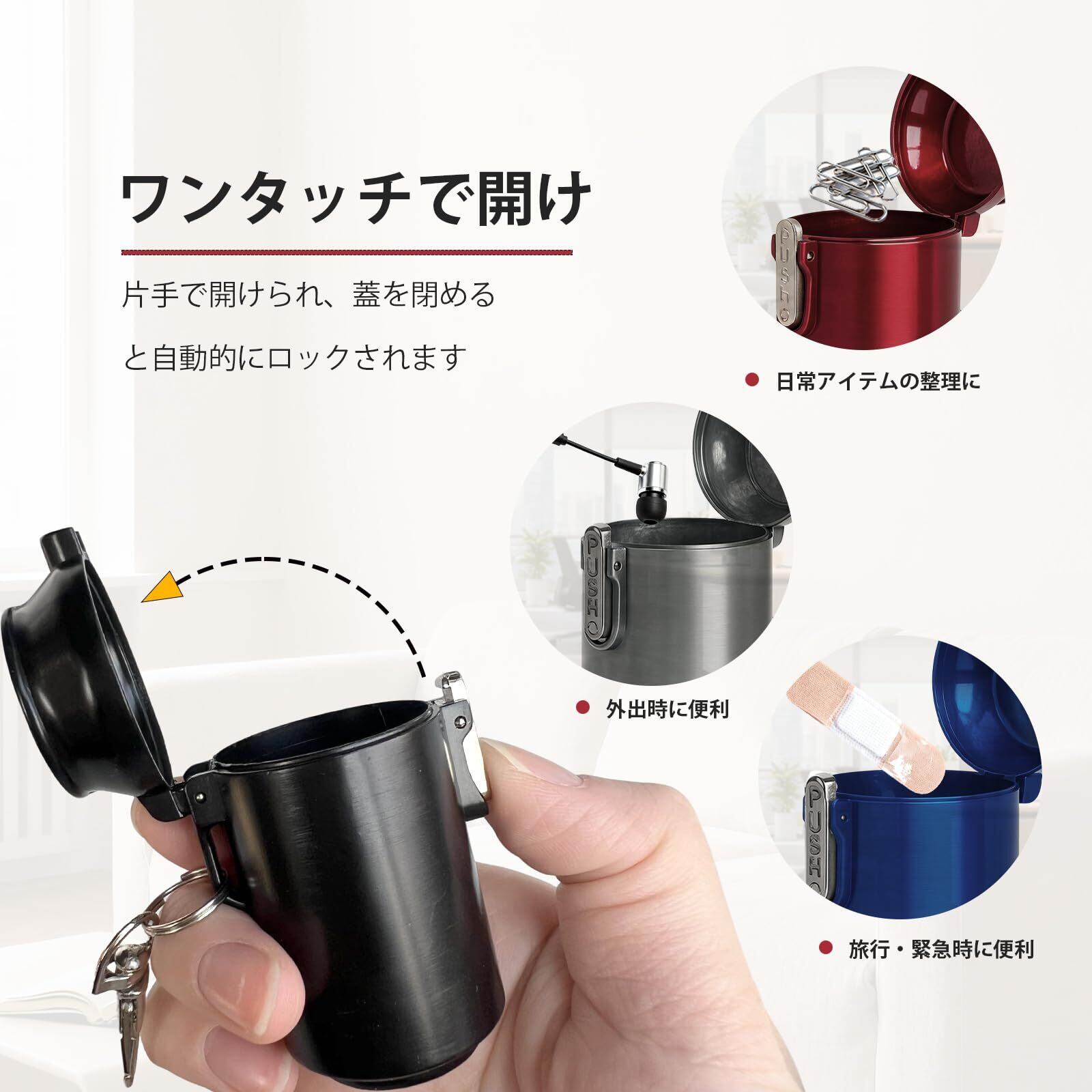 【多機能・ポータブルデザイン】直径41mm × 高さ63mmのコンパクトサイズで、8〜10本の吸い殻を収納可能。付属のカラビナでバッグやベルトに取り付けられ、携帯はいざらとして外出時にも大活躍。さらに、アクセサリーケース・ミニ救急ボックス・小物入れとしても使用できる多機能設計。ビジネスシーンでもアウトドアでも、これ一つで多用途に対応します。