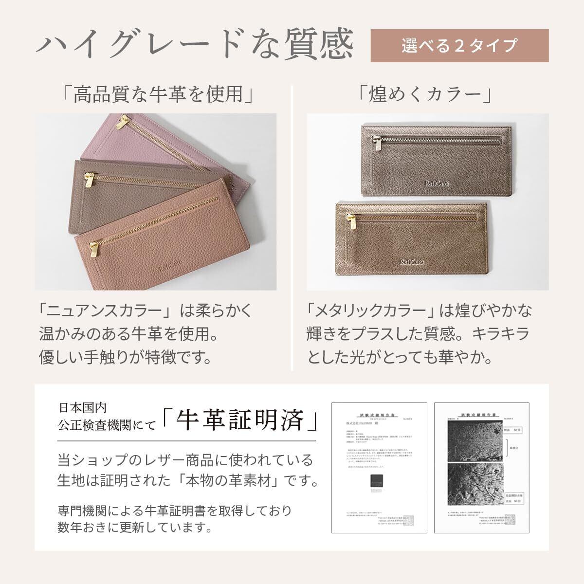 【ブランド】 RafiCaro - ラフィカロ - 【品番】 7395 【スペック】 ・カードポケット × 6 ・お札入れ × 1 ・インナーポケット × 1 ・小銭入れ × 1 【サイズ】 ・縦 90mm × 横 193mm × 厚み 10mm ・重さ 62g 【素材】 ・アウター:牛革 ・インナー:ナイロン ・ファスナー:YKK EXCELLA 【最薄部わずか3mmの長財布】 フラグメントケースのスタイリッシュさと長財布の安心感をひとつにした極薄ロングウォレットです。スリムでもお財布としての機能はしっかり。サイドのカットで取り出しやすいカードポケット、片側マチで大きく開く小銭入れ。お札も折らずにそのまま入ります。サブ財布や旅行用財布としてもおすすめです。 【素材にもこだわり】 表地は柔らかで上品な質感の牛革。ファスナーはYKKで最高峰のクオリティを誇るEXCELLAを使用。美しい艶消し金具はアウター生地との馴染みがよく、滑らかな使い心地。人気ブランドならではのこだわりが詰まったアイテムです。 人気の7カラーをラインナップ。かわいい、おしゃれ、クール、カジュアル、ビジネス、フォーマルなどスタイルに合わせてお選び頂けます。 記念日 などの プレゼント 母の日 バレンタインデー ホワイトデー 誕生日 クリスマス 等の ギフト にも おすすめ です。green グリーン / blue ブルー / dustypink ダスティピンク / greige グレージュ / lavender ラベンダー / champagnegold シャンパンゴールド / darksilver ダークシルバー