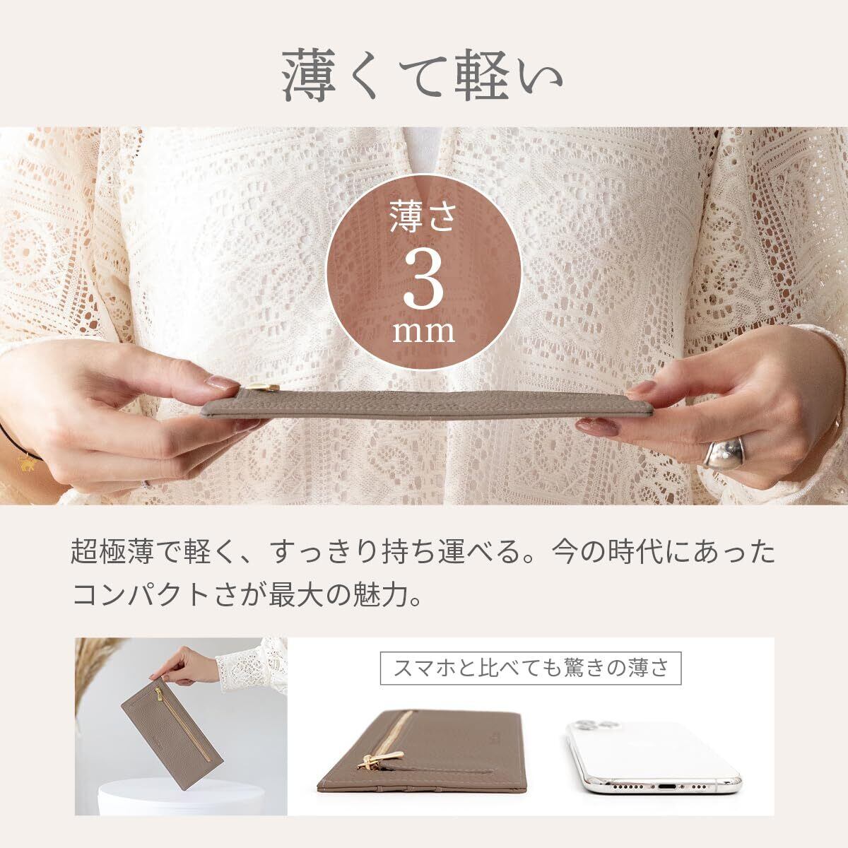 【最薄部わずか3mmの長財布】 フラグメントケースのスタイリッシュさと長財布の安心感をひとつにした極薄ロングウォレットです。スリムでもお財布としての機能はしっかり。サイドのカットで取り出しやすいカードポケット、片側マチで大きく開く小銭入れ。お札も折らずにそのまま入ります。サブ財布や旅行用財布としてもおすすめです。