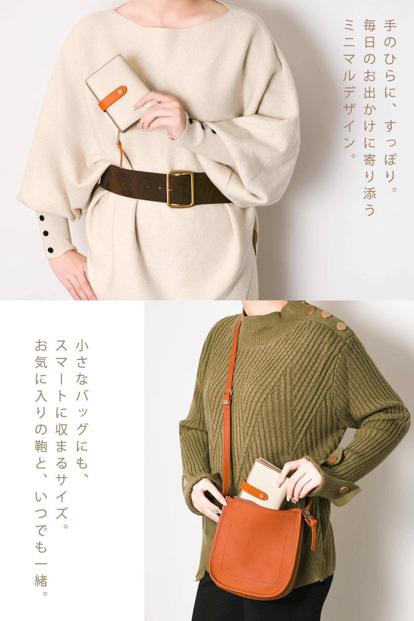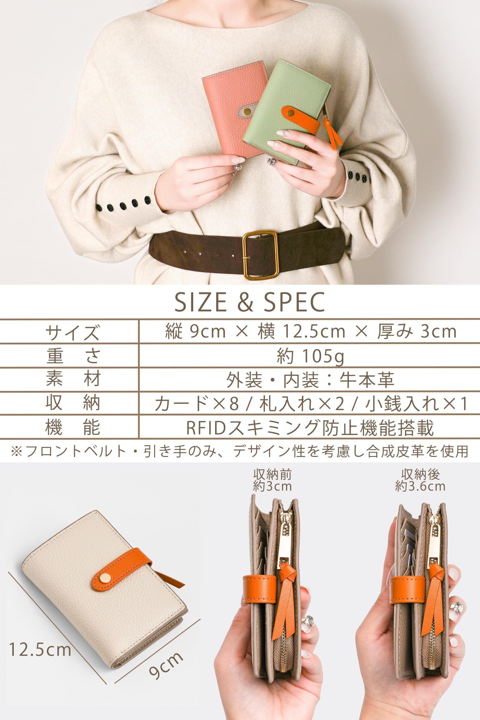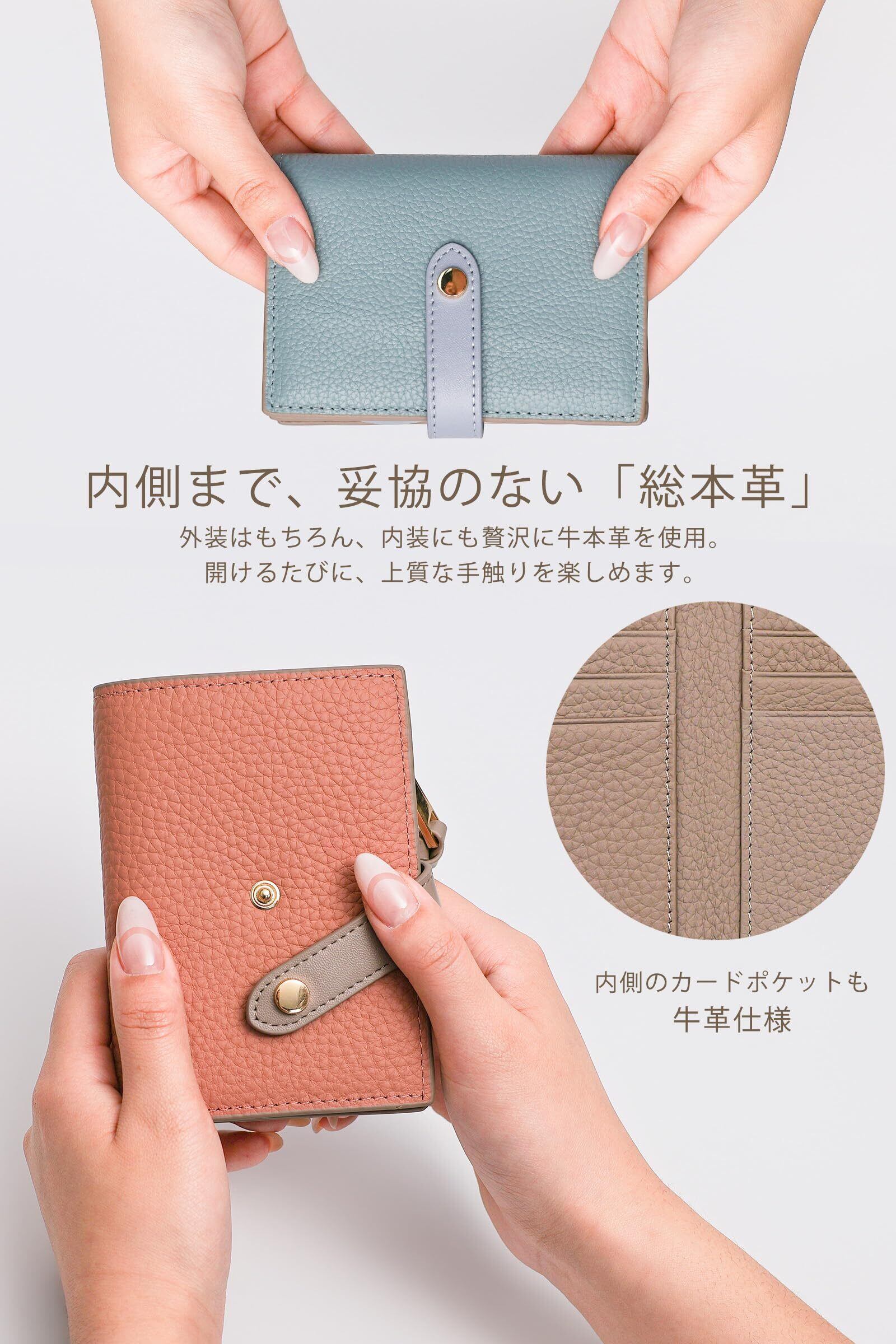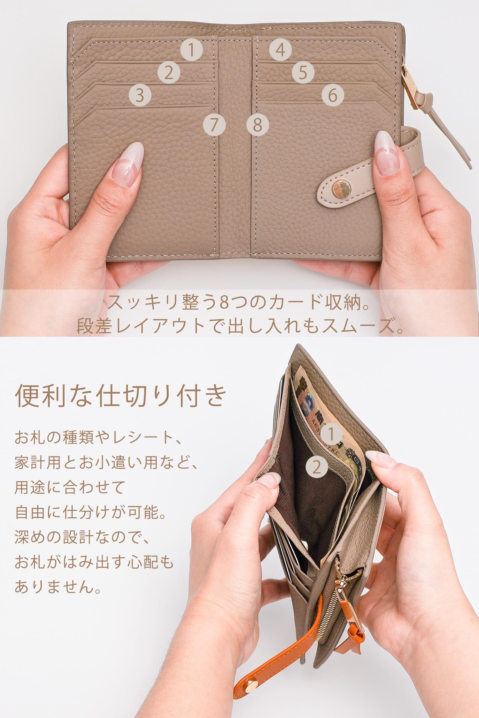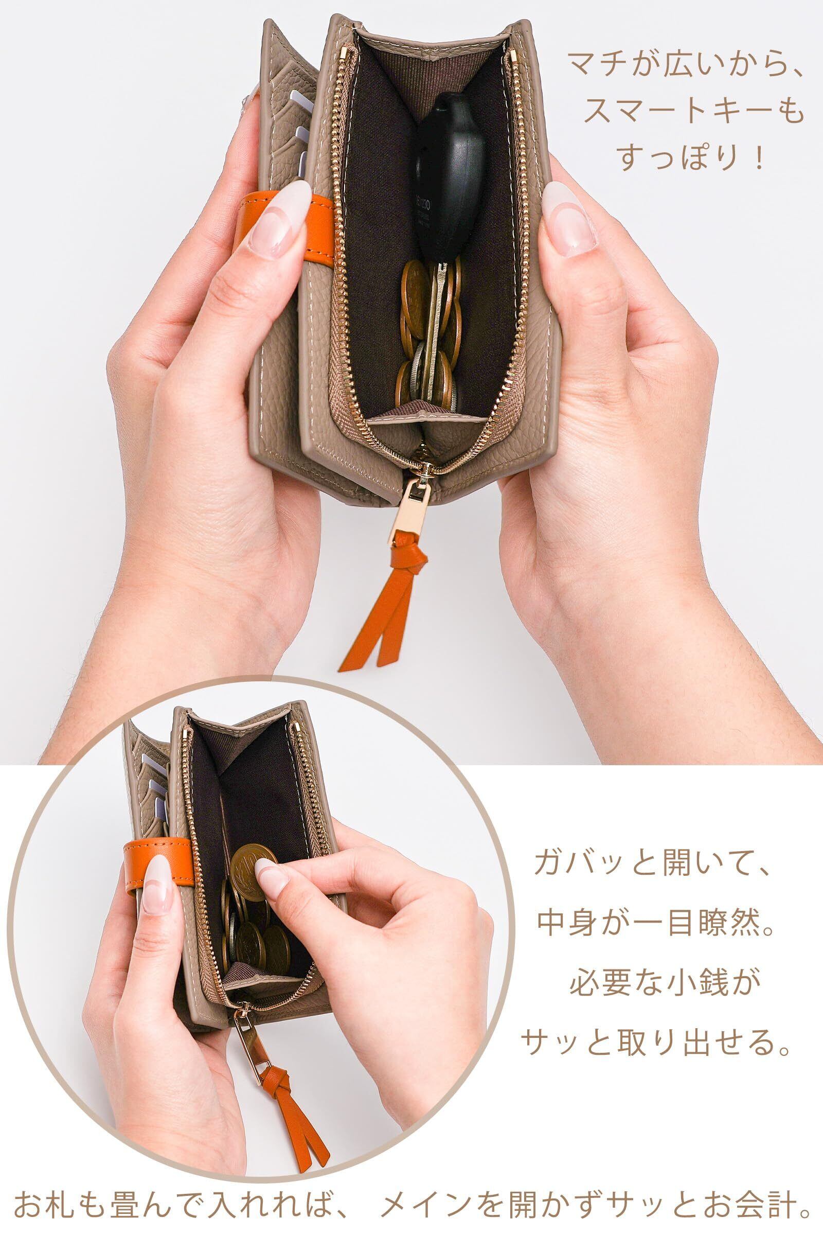 【表情の違いを楽しめるバイカラー配色】 外側と内側の色味のコントラストを楽しめるバイカラーデザイン。ブラックにはアクセントになるオレンジ内装、レッドには引き締め役のブラック内装を採用し、それ以外のカラーには中身が見やすい明るめグレーベージュの内装を合わせました。落ち着いた印象の中にさりげない遊び心があり、きれいめコーデにもカジュアルスタイルにも合わせやすい、大人のためのミニ財布です。