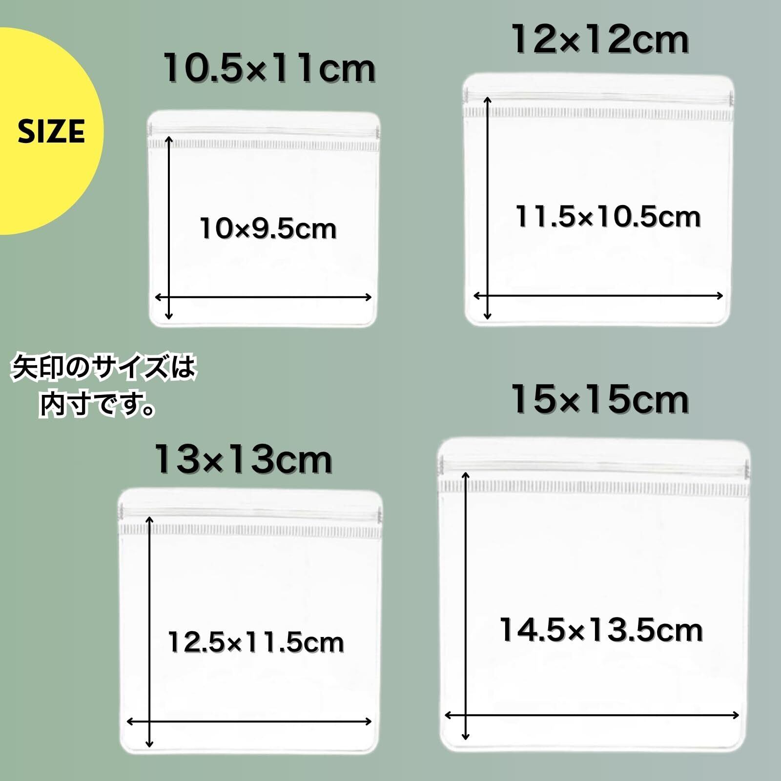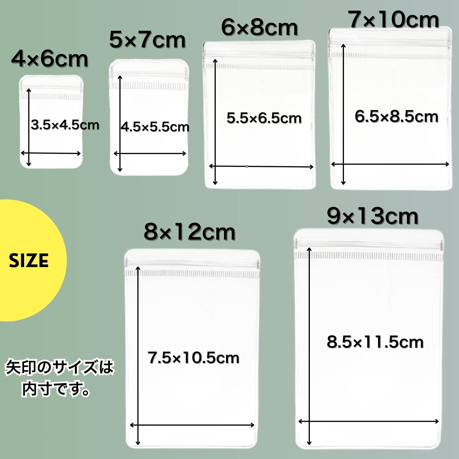 【サイズ・バリエーション】標準0.26mm/厚手0.48mmの2種類。4×6cm100枚、5×7cm100枚、6×8cm100枚、7×10cm50枚、8×12cm50枚、9×13cm50枚、10.5×10.8cm50枚、12×12cm50枚、13×13cm50枚、15×15cm50枚。カラー:透明(※サイズは目安、手計測のため誤差あり)。