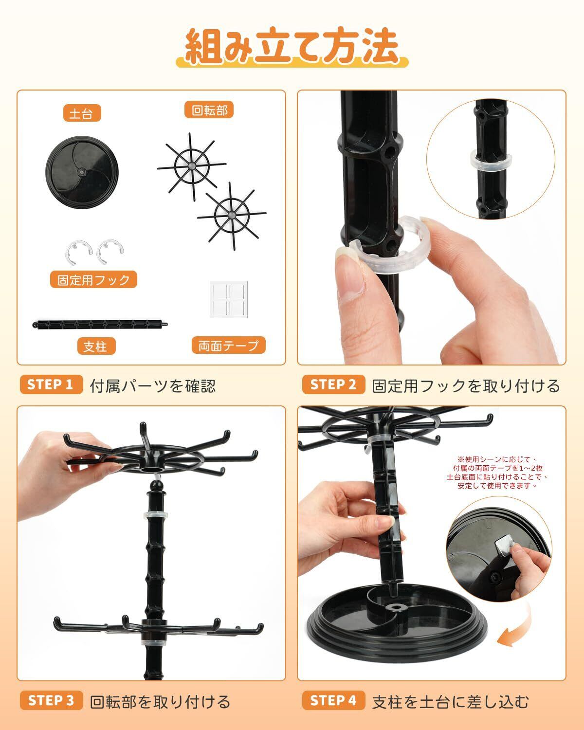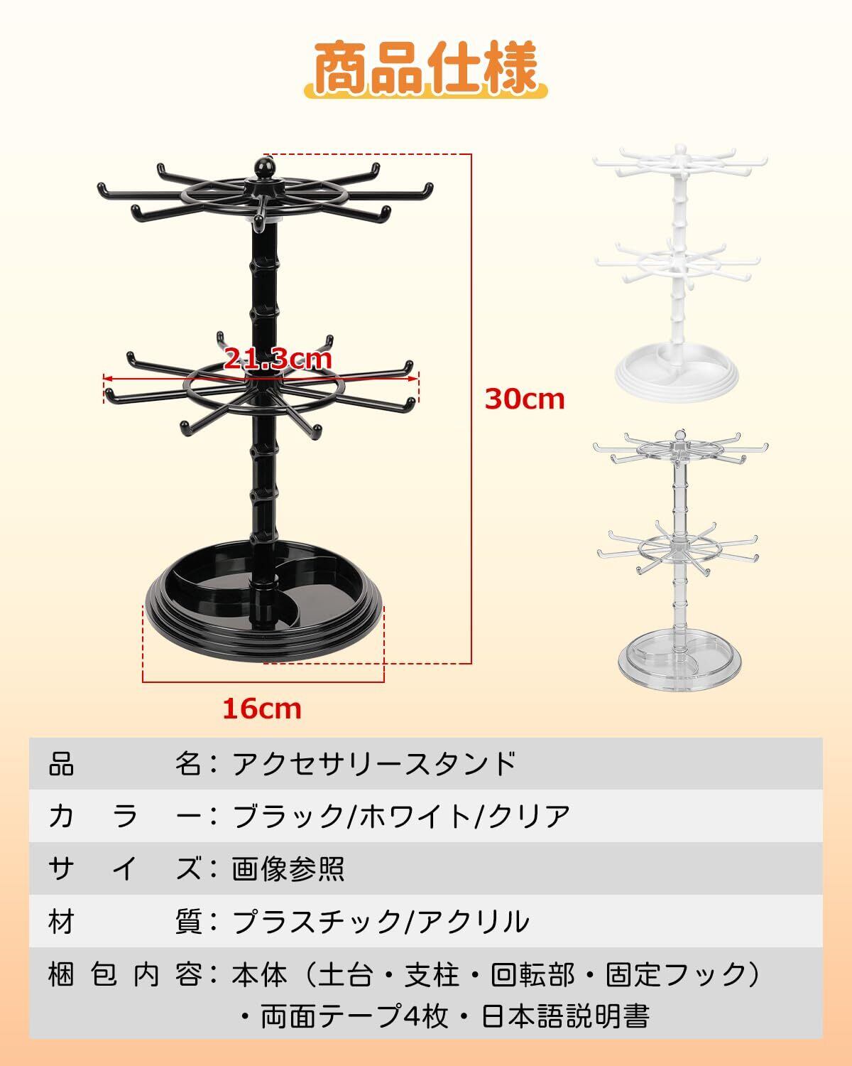 【商品仕様】品名:アクセサリースタンド サイズ:画像参照 カラー:ブラック/ホワイト/クリア 梱包内容:本体(土台・支柱・回転部・固定フック)・両面テープ4枚・日本語説明書