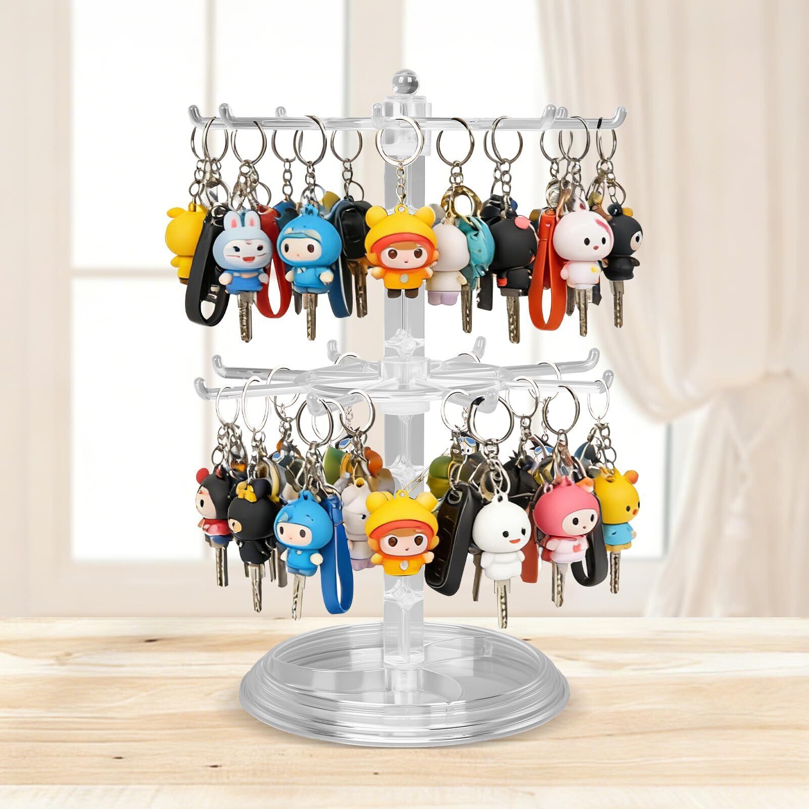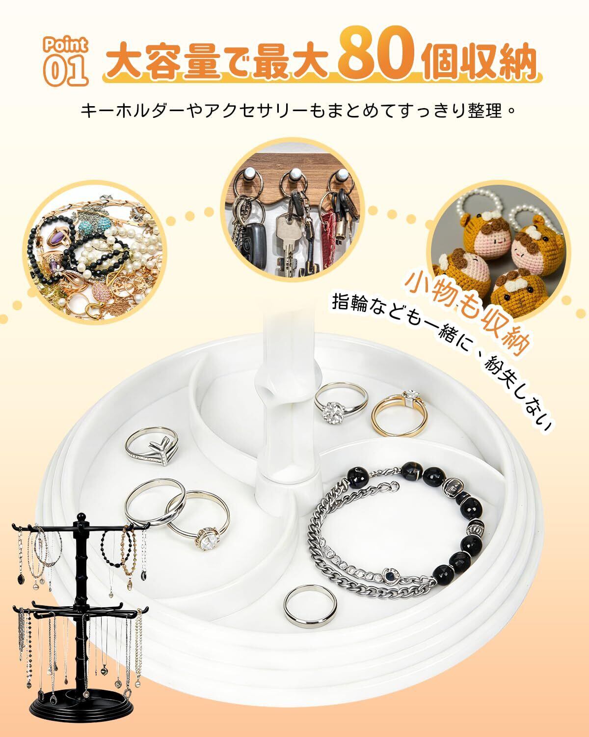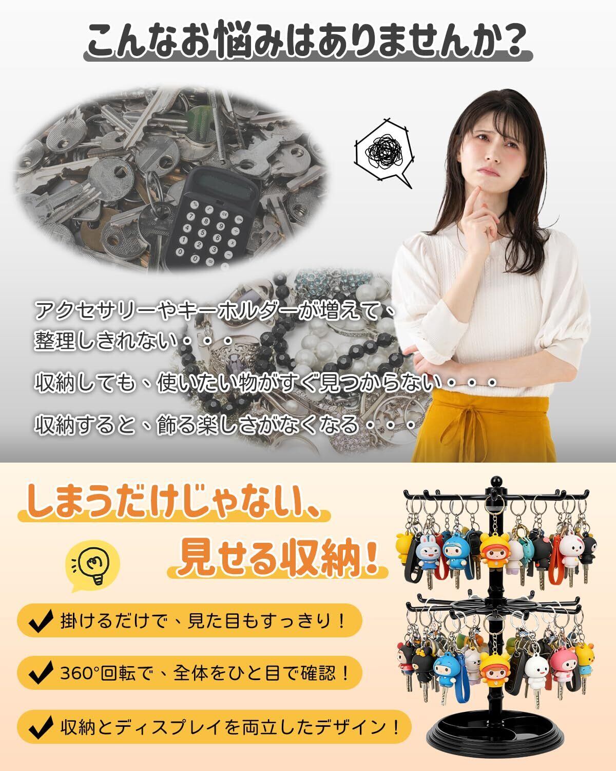 【回転式で見やすい2段スタンド】360度回転する2段構造のスタンドで、キーホルダーだけでなく、ネックレスやブレスレットなどのアクセサリーも掛けて収納可能。全体を一目で確認でき、絡まりを防ぎます。